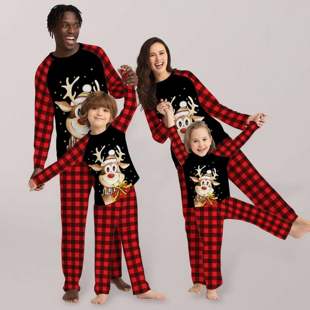- Cartoon deer plaid pattern – charming, festive print that adds personality to lounge wear and holiday photos.