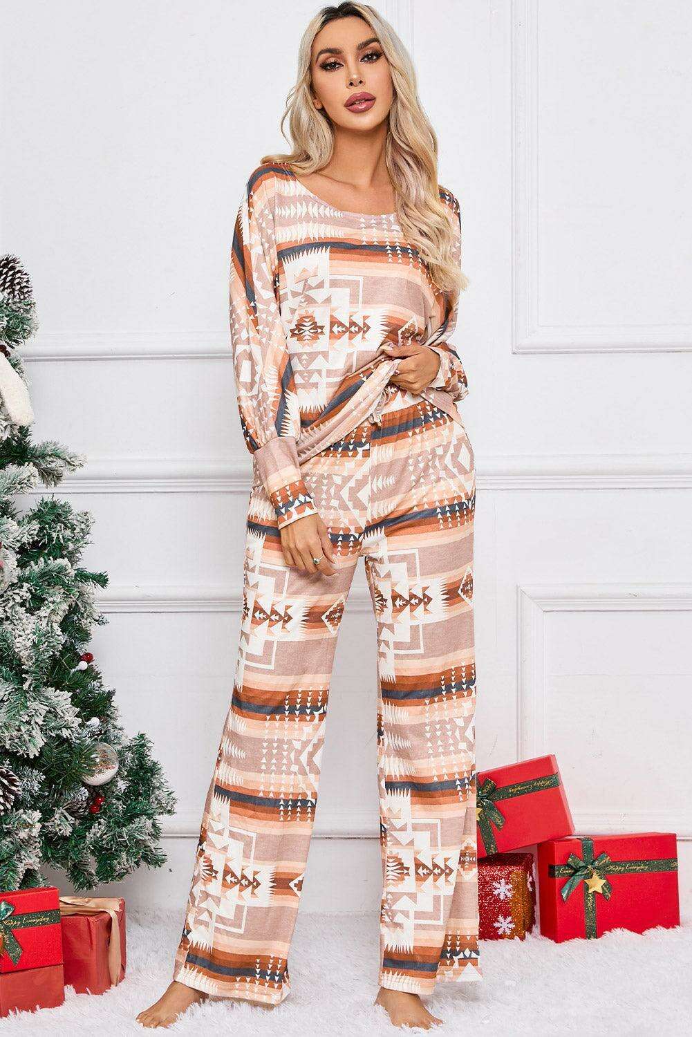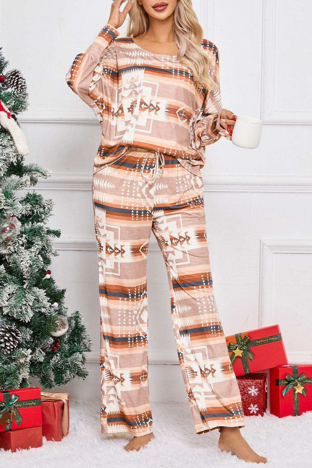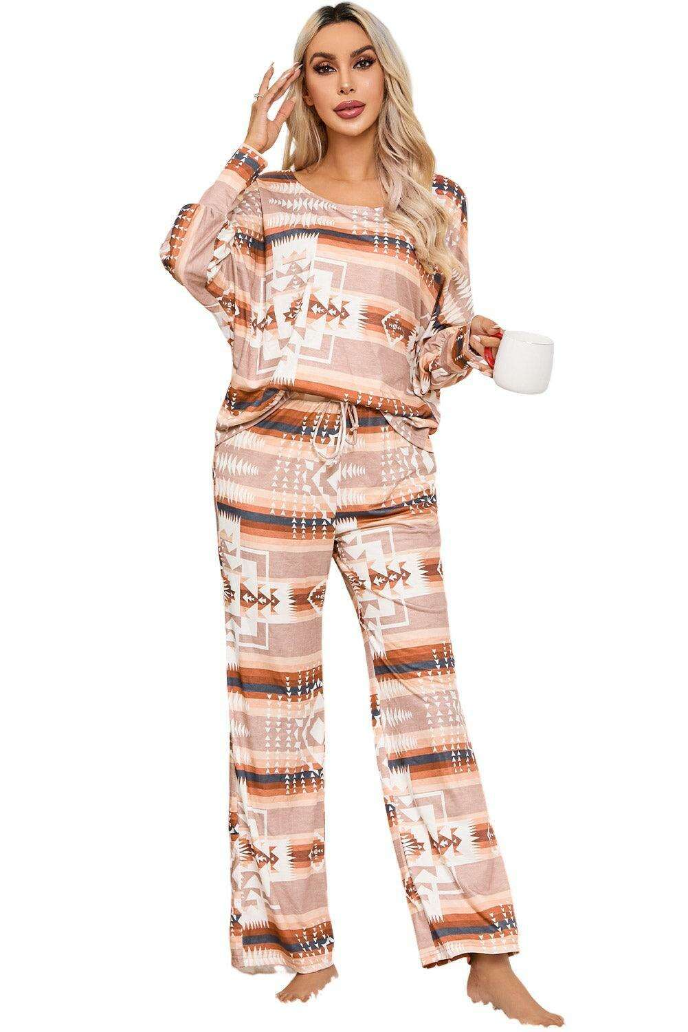 Chic Aztec-Inspired Lounge Set with Elegant Puff Sleeves & Adjustable Drawstring