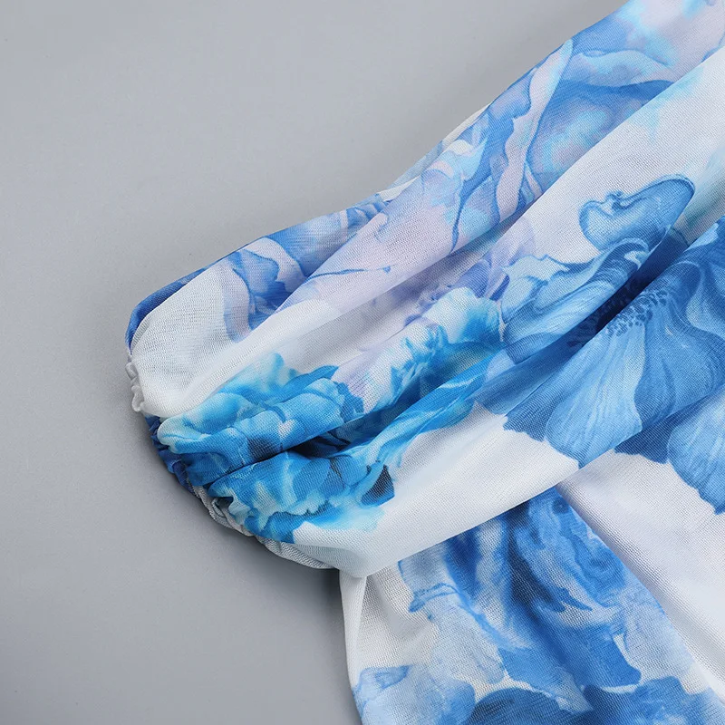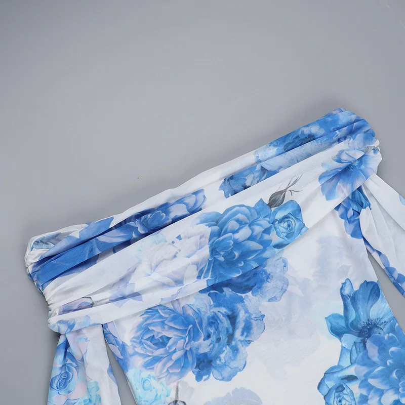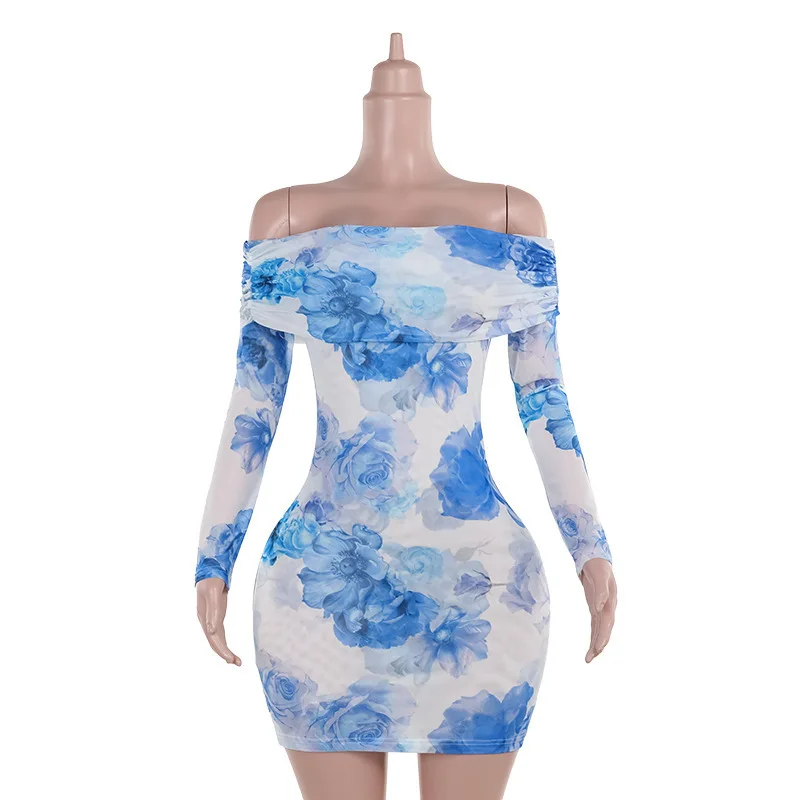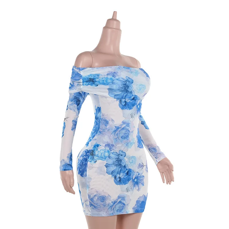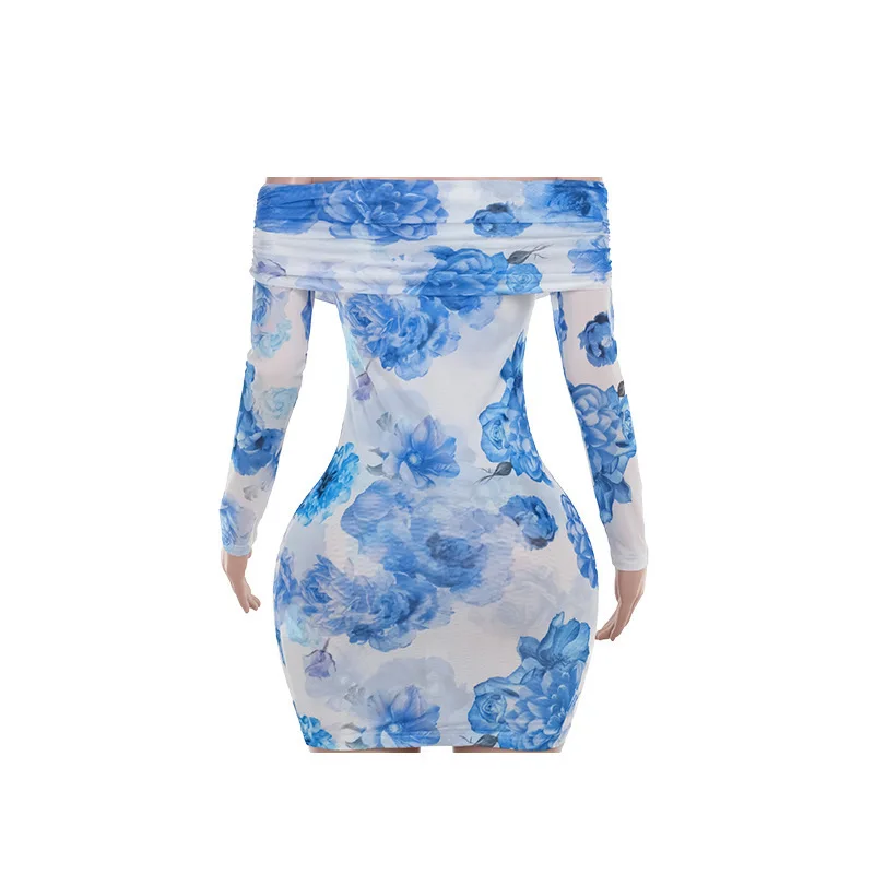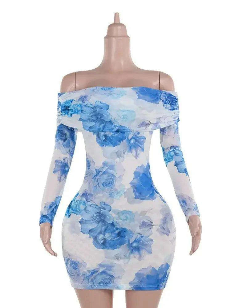 Chic Blue Floral Off-Shoulder Mini Dress for Women - Elegant Backless Long Sleeve High Waist Party Wear for Autumn