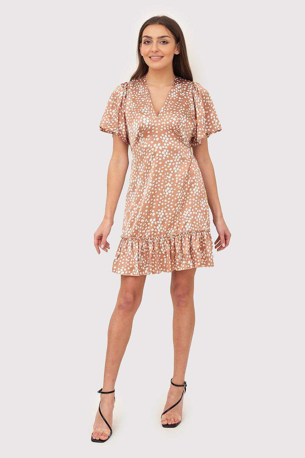 Chic Brown Frill-Trimmed Mini Dress with Flared Sleeves and V-Neckline