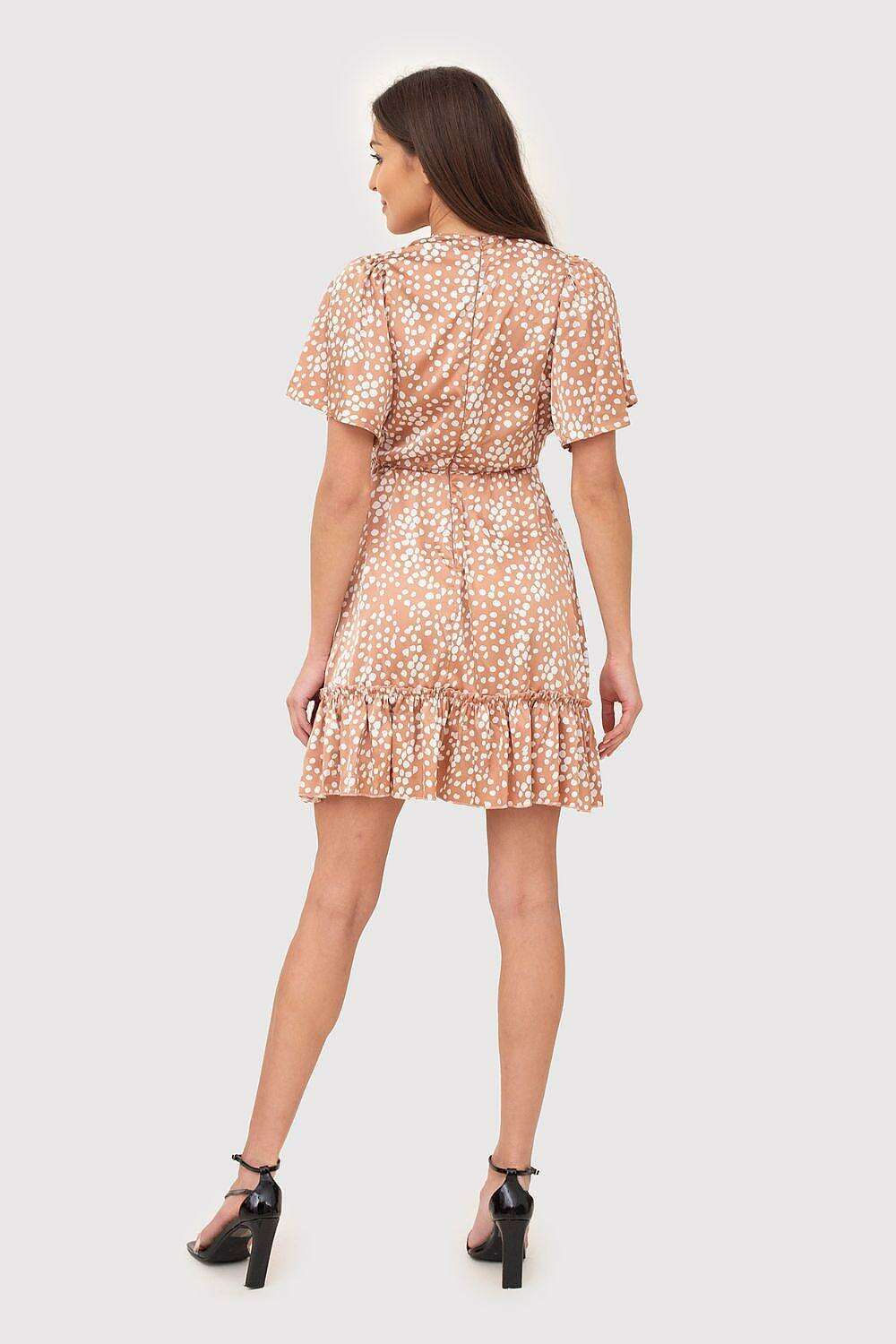 Brown Frilled Mini Dress with Wide Sleeves and V-Neck