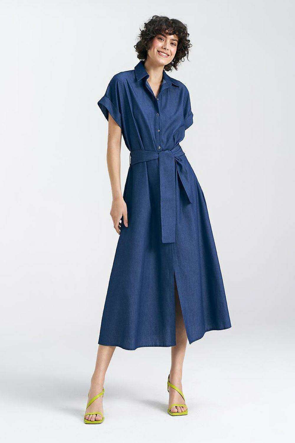 Chic Cotton Denim Midi Dress With Kimono Sleeves Snap