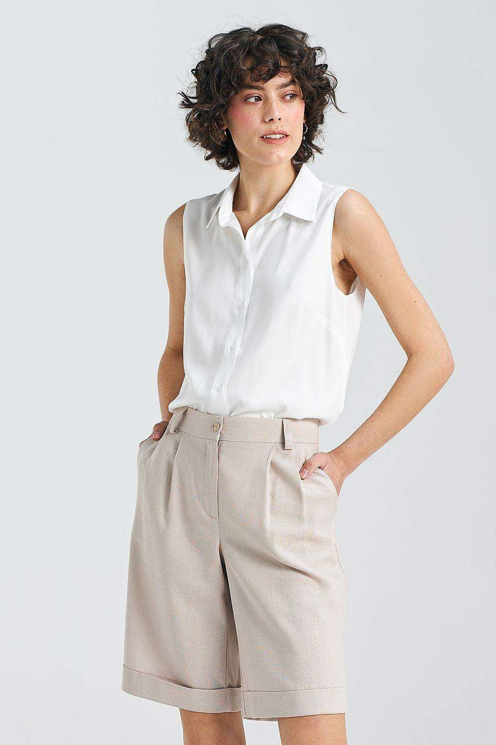 Elevate your wardrobe with our Chic Sleeveless Viscose Blouse featuring a timeless collar. This elegant sleeveless shirt brings together simplicity and sophistication, designed with a regular cut that flatters every figure and serves as an indispensable item in a modern woman's wardrobe.
