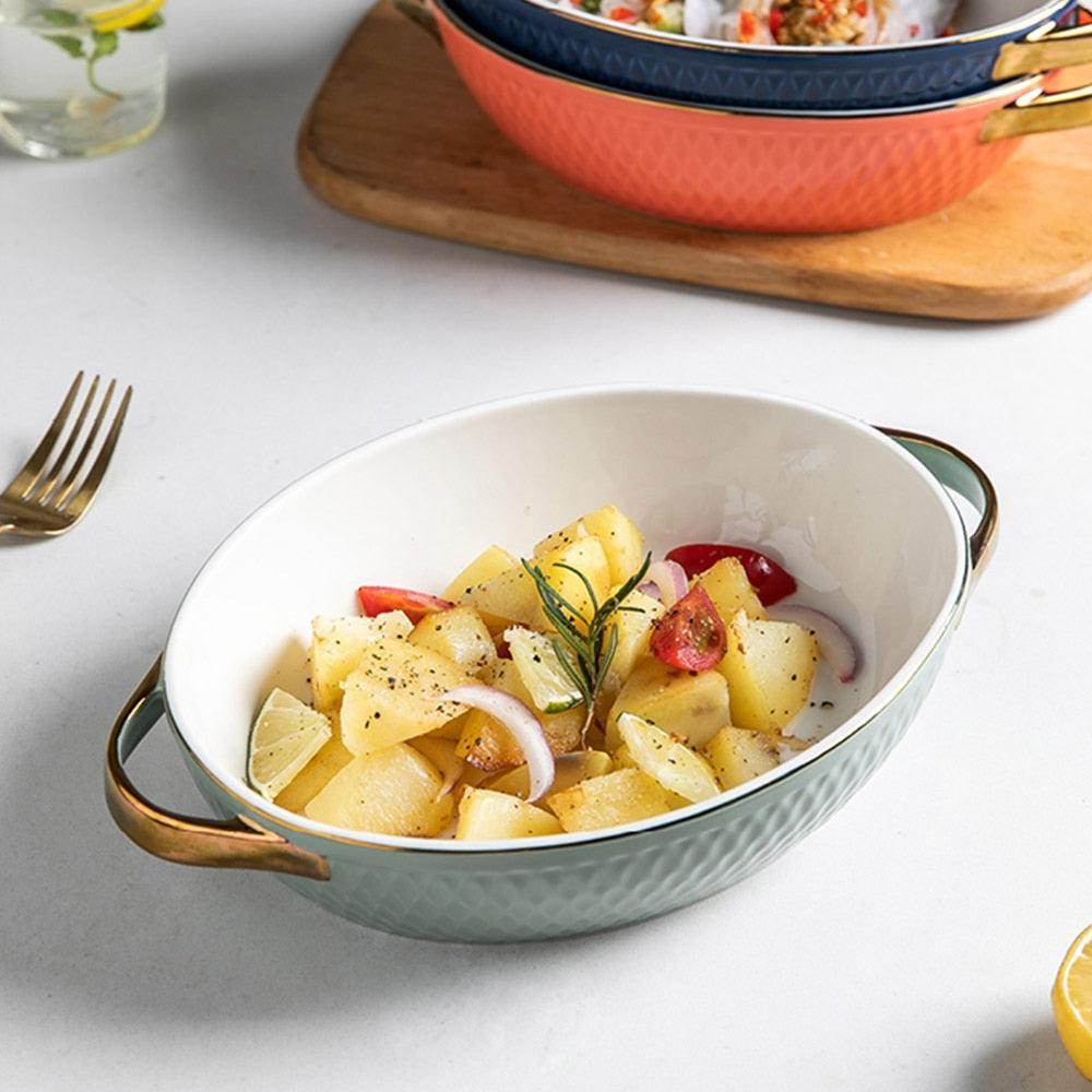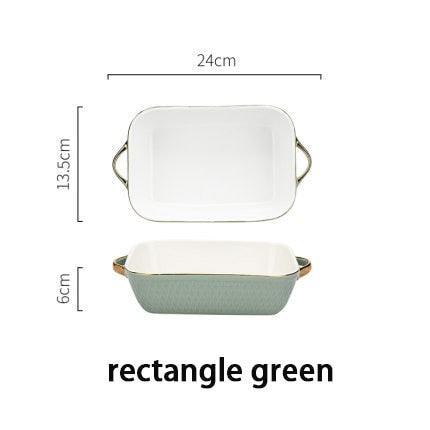 Unique Aesthetic Design: Our baking trays come in both rectangular and round shapes, featuring a generous 600ml capacity and an elegant golden edge. The innovative handle design not only adds to their beauty but also ensures that you can handle them safely, even when they're hot.