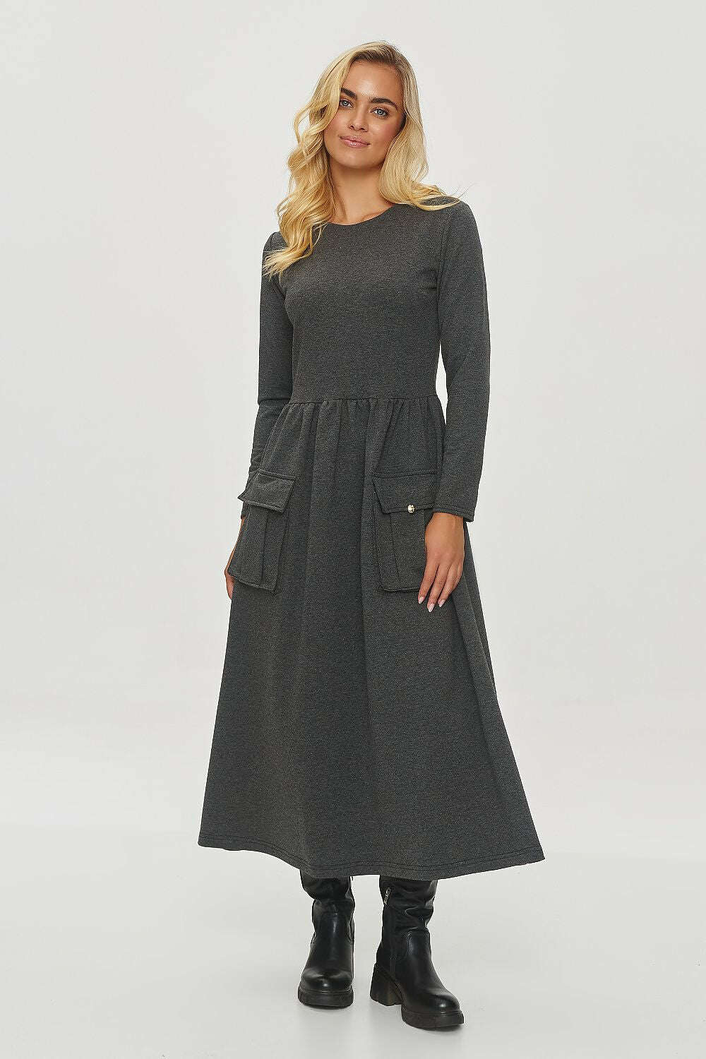 A flared dress is a perfect choice for people who value the combination of style and functionality. The model has a classic, feminine cut with a midi length and a flared bottom. Made of soft, comfortable material that works great for everyday use. The dress has long sleeves, making it ideal for cooler days. The waist cut gives the effect of subtle wrinkling, which emphasizes the silhouette and adds charm to the dress. The characteristic element is large, sewn-on pockets at the front, additionally decorated with an elegant gilded detail, which not only adds style but also serves a practical function. This model combines comfort and fashionable design, making it an ideal choice for different occasions.