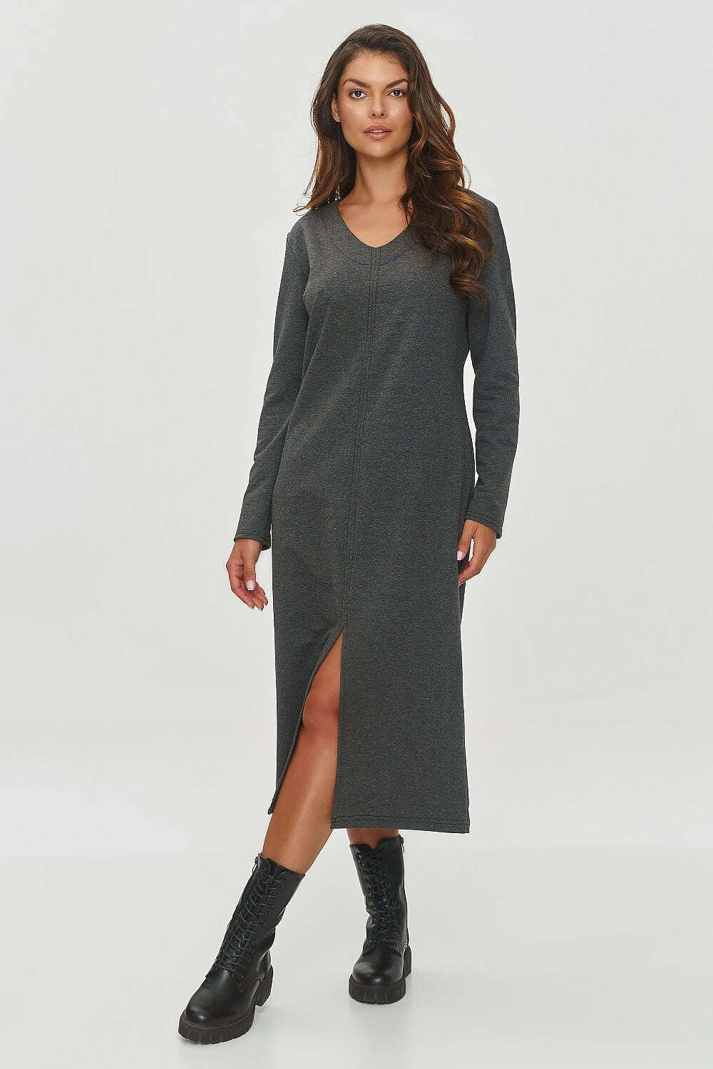 A sweatshirt dress is an elegant, yet simple proposition for everyday wear, which combines minimalism with a touch of style. The model has a simple, body-hugging cut that emphasizes the silhouette, but remains comfortable at the same time. The length of the dress reaches mid-calf, giving it a classic character. The soft and stretchy material ensures comfort for all-day wear. The dress has long sleeves, perfect for cooler days. The neckline has a V-shape, which visually elongates the neck and adds elegance. There is a subtle slit at the bottom of the dress, adding lightness and allowing for freedom of movement. You can pair it with white sneakers for a sporty yet elegant look, or wear it with ankle boots or ballet flats for a more formal effect. This dress is the perfect choice for everyday outings, meetings with friends, or for work. Thanks to its simple cut and elegant details, it can be easily styled for different occasions.