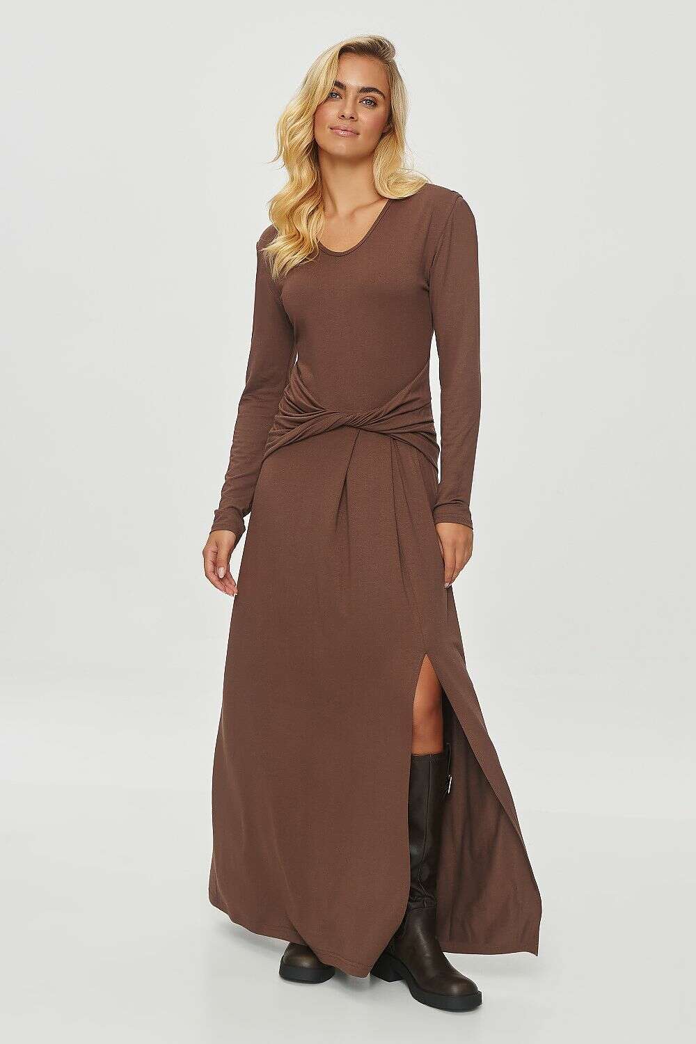 A long and elegant dress made of pleasant to the touch viscose is a great foundation for creating interesting stylizations. The model has a fitted top that accentuates the waist and bust, while small pads are placed on the shoulders, which fantastically shape the upper part of the model. The neckline in the shape of a gentle V subtly emphasizes the neck and perfectly highlights femininity. The waist is accentuated by an original fold that creates an interesting draping effect. This element adds elegance to the dress and makes the silhouette visually slim and additionally masks imperfections around the belly. The draping smoothly transitions down the dress, creating folds that add lightness and dynamism to it. Such a solution creates an impressive stylization and definitely attracts attention. The model has a subtle slit in the front that reveals the legs while walking, adding delicacy and sex appeal to the creation. The dress is perfect for both elegant evening outings and more casual occasions, if paired with less formal accessories such as sporty footwear. Its simplicity and interesting details make it a universal and stylish choice.