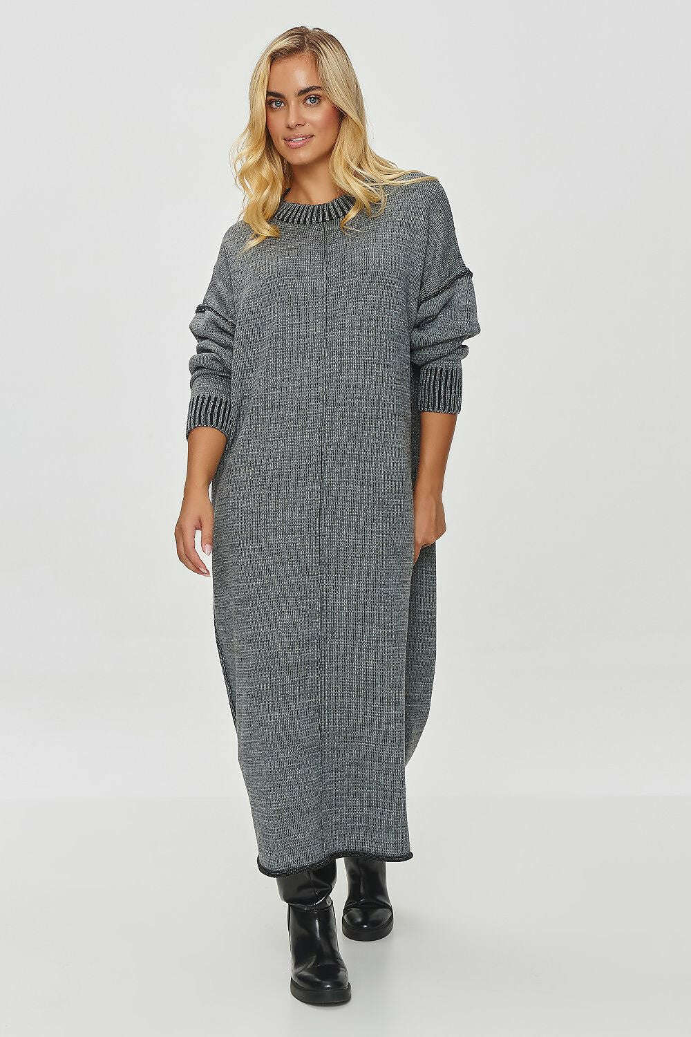 Long women's sweater with a loose fit, made of melange pattern fabric. The sweater has an oversize cut with long sleeves, which adds to its comfort and casual style, and the lowered shoulder line perfectly masks the more massive shoulders. It is finished with wide ribs on the sleeves, so you can adjust their length while blousing them. The neckline is rounded and finished with a ribbed hem. The sweater reaches to the ankles, creating an elegant and original look, perfect for colder days. A vertical seam is visible on the front, which adds subtle detail to the sweater and optically elongates the silhouette. It is an ideal choice for autumn and winter days, going well with styling with high boots. The sweater combines comfort and style, so it can be worn both on a daily basis and for more elegant occasions.