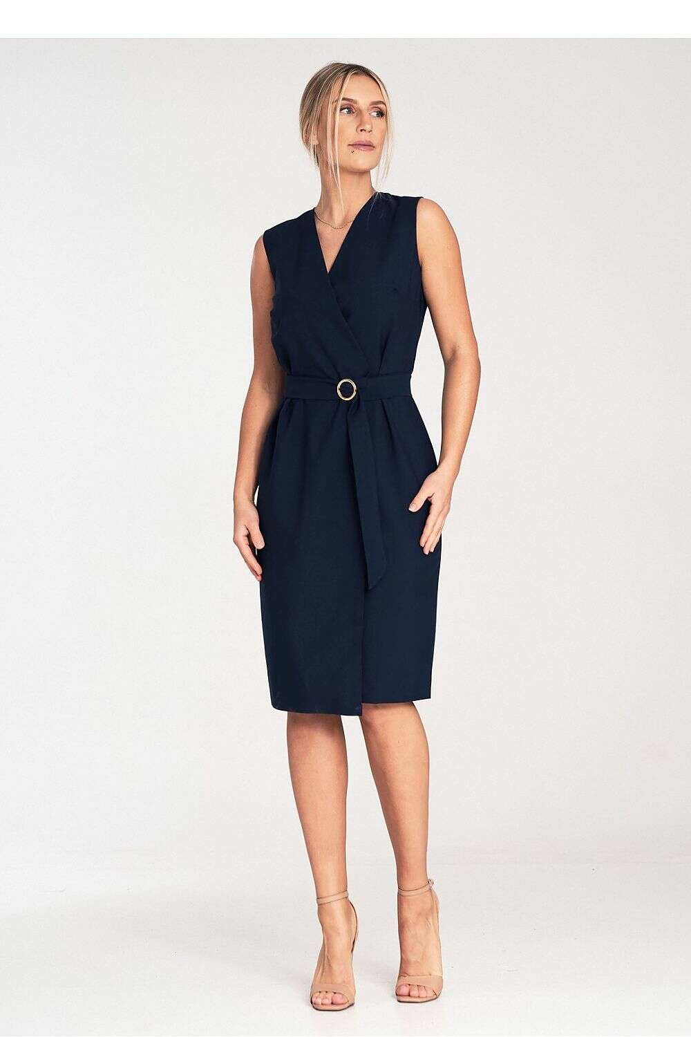 Sleeveless midi dress. Pencil bottom dress without pockets. Dress with a belt and decorative gold metal buckle. Wrap neckline.