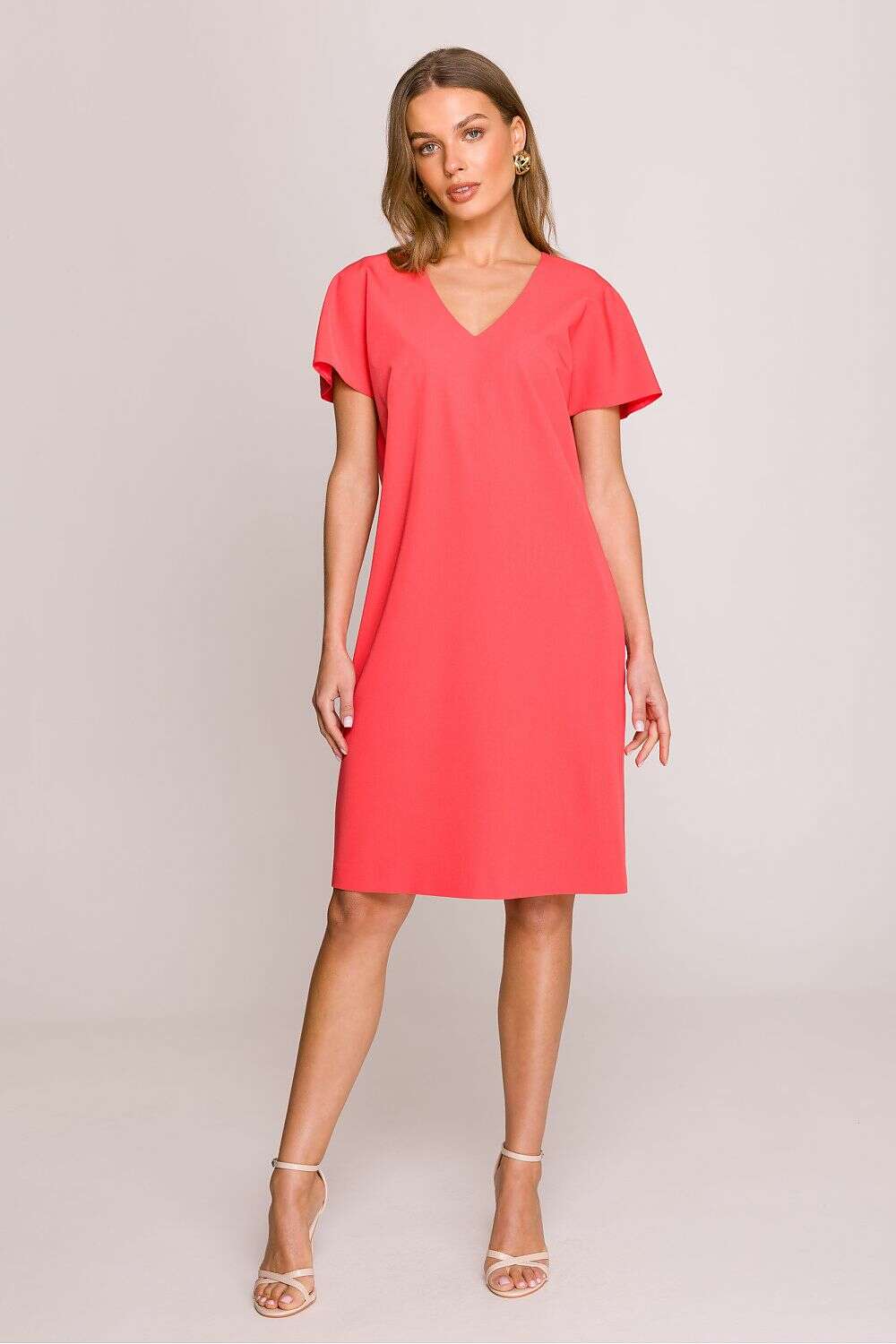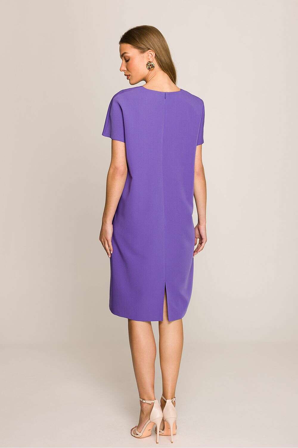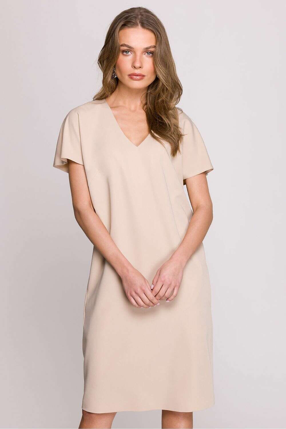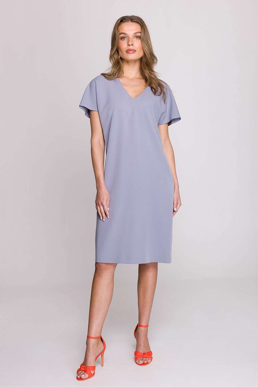 Dress with a loose fit that provides freedom of movement and comfort throughout the day. Knee-length makes it a versatile choice for many occasions. Short sleeves add lightness, perfect for warmer days. The V-neck subtly accentuates the neck, giving the dress a feminine character. Covered zipper at the back ensures easy dressing, while an additional slit at the bottom adds a touch of elegance. The dress is unlined, making it even more breathable and comfortable. Designed and made in Poland, guaranteeing high quality and attention to detail. A perfect choice for women who appreciate style, comfort, and elegance in their everyday outfits.