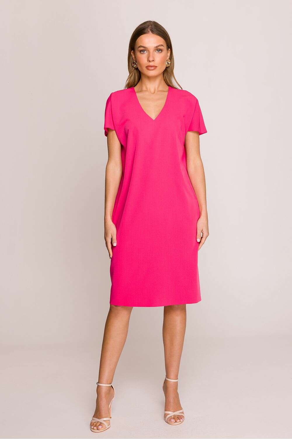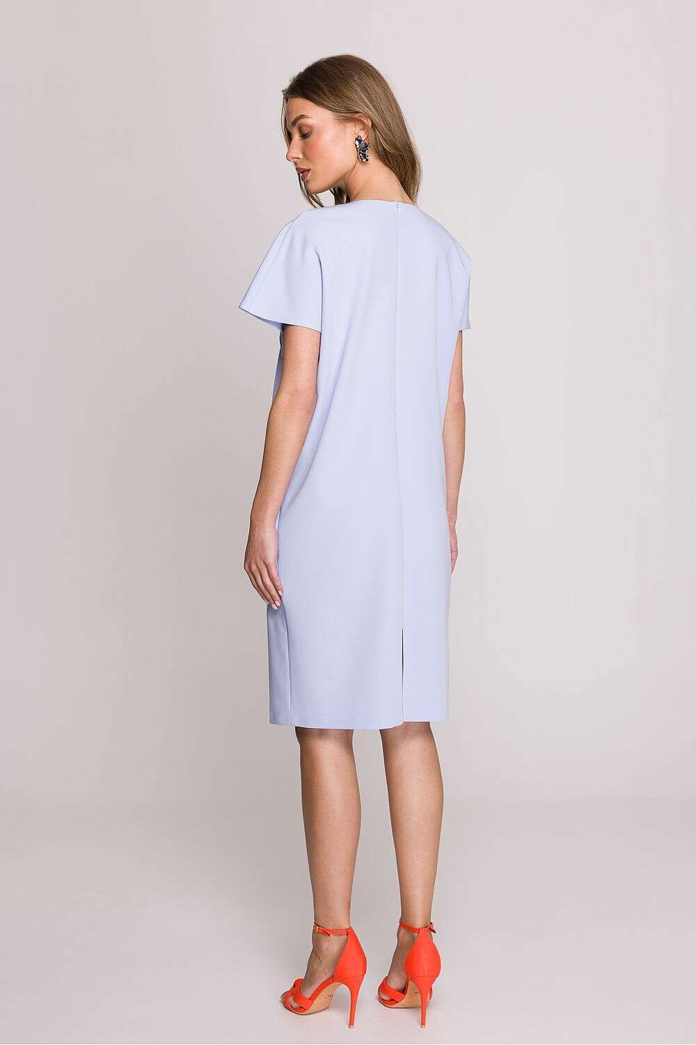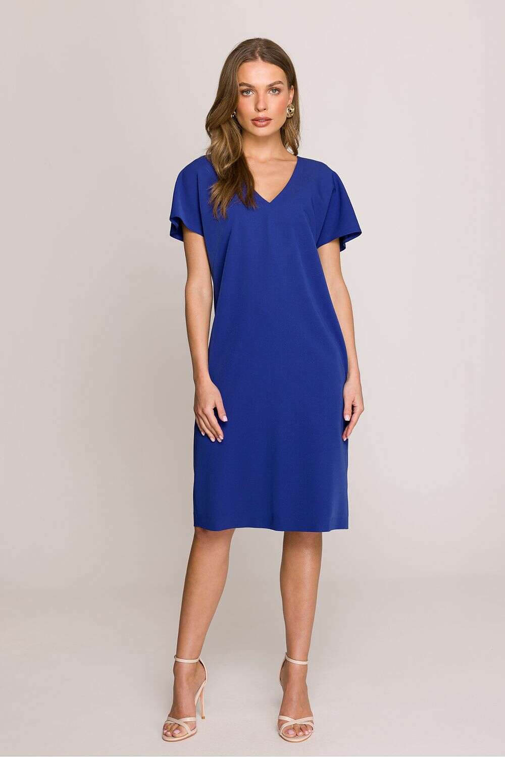 Dress with a loose fit that provides freedom of movement and comfort throughout the day. Knee-length makes it a versatile choice for many occasions. Short sleeves add lightness, perfect for warmer days. The V-neck subtly accentuates the neck, giving the dress a feminine character. Covered zipper at the back ensures easy dressing, while an additional slit at the bottom adds a touch of elegance. The dress is unlined, making it even more breathable and comfortable. Designed and made in Poland, guaranteeing high quality and attention to detail. A perfect choice for women who appreciate style, comfort, and elegance in their everyday outfits.