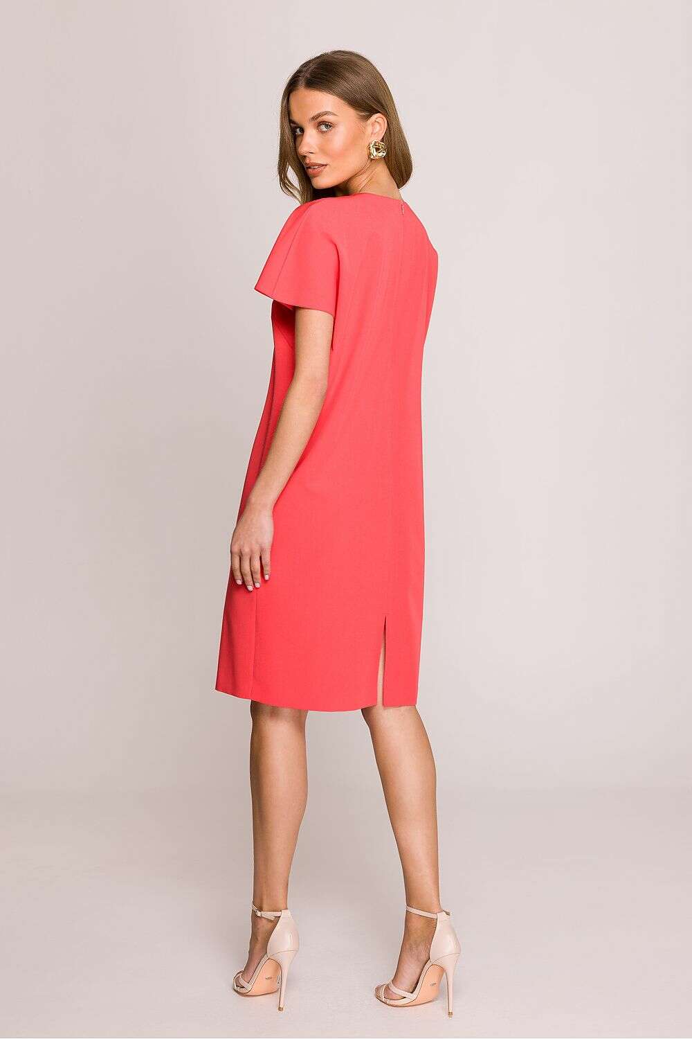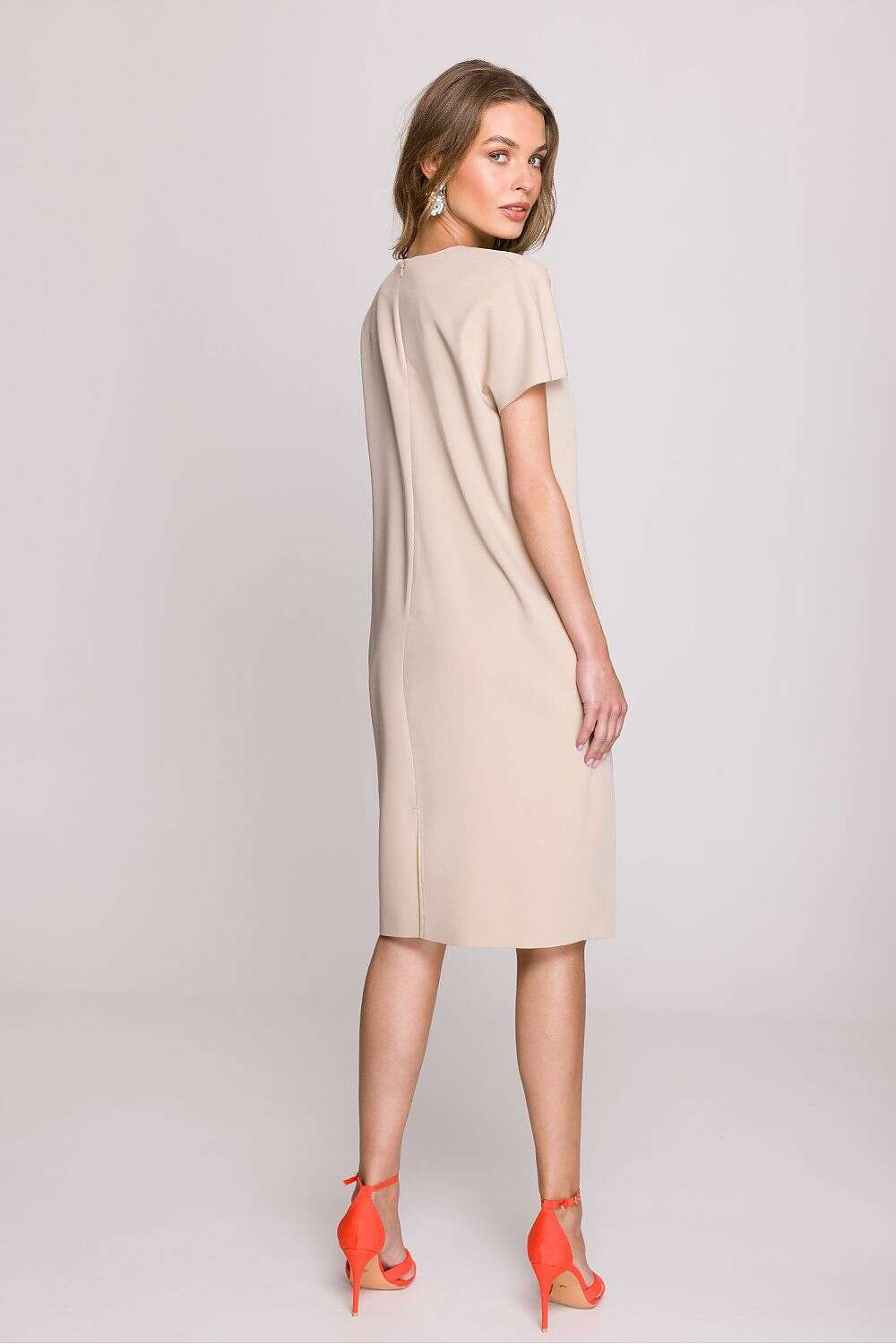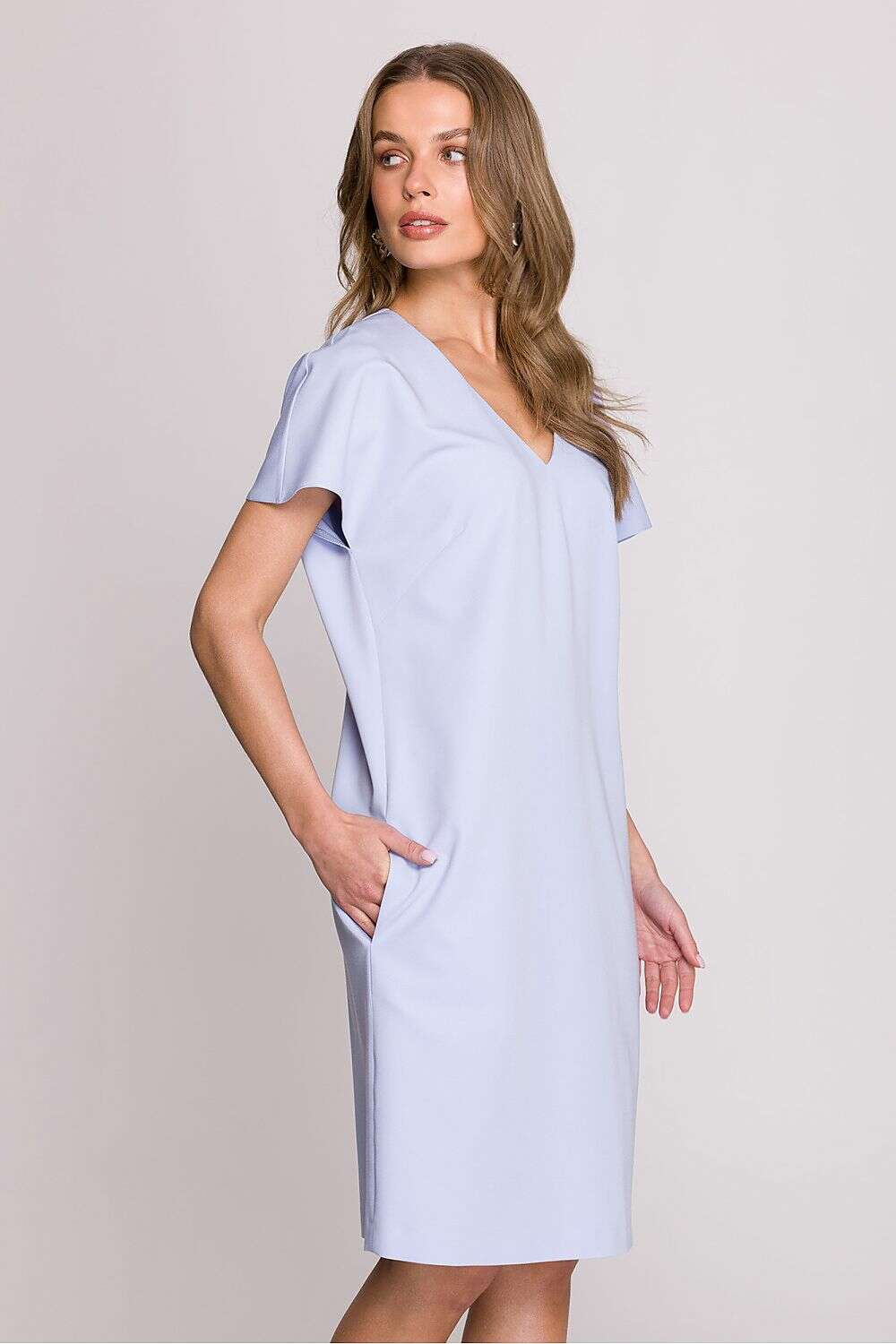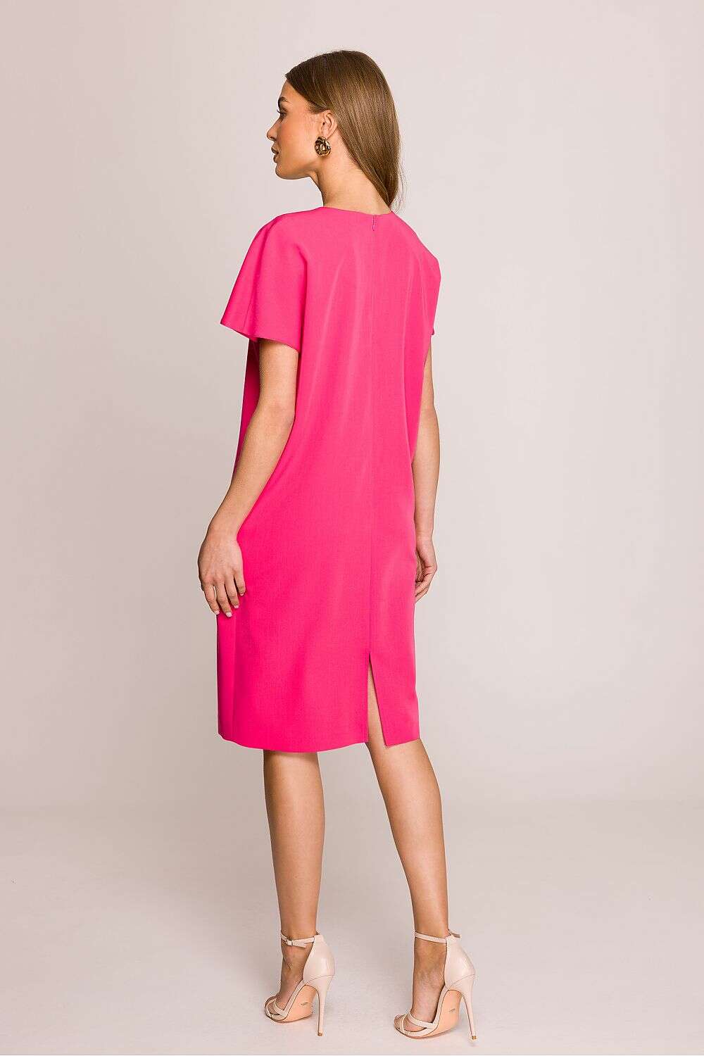 Dress with a loose fit that provides freedom of movement and comfort throughout the day. Knee-length makes it a versatile choice for many occasions. Short sleeves add lightness, perfect for warmer days. The V-neck subtly accentuates the neck, giving the dress a feminine character. Covered zipper at the back ensures easy dressing, while an additional slit at the bottom adds a touch of elegance. The dress is unlined, making it even more breathable and comfortable. Designed and made in Poland, guaranteeing high quality and attention to detail. A perfect choice for women who appreciate style, comfort, and elegance in their everyday outfits.
