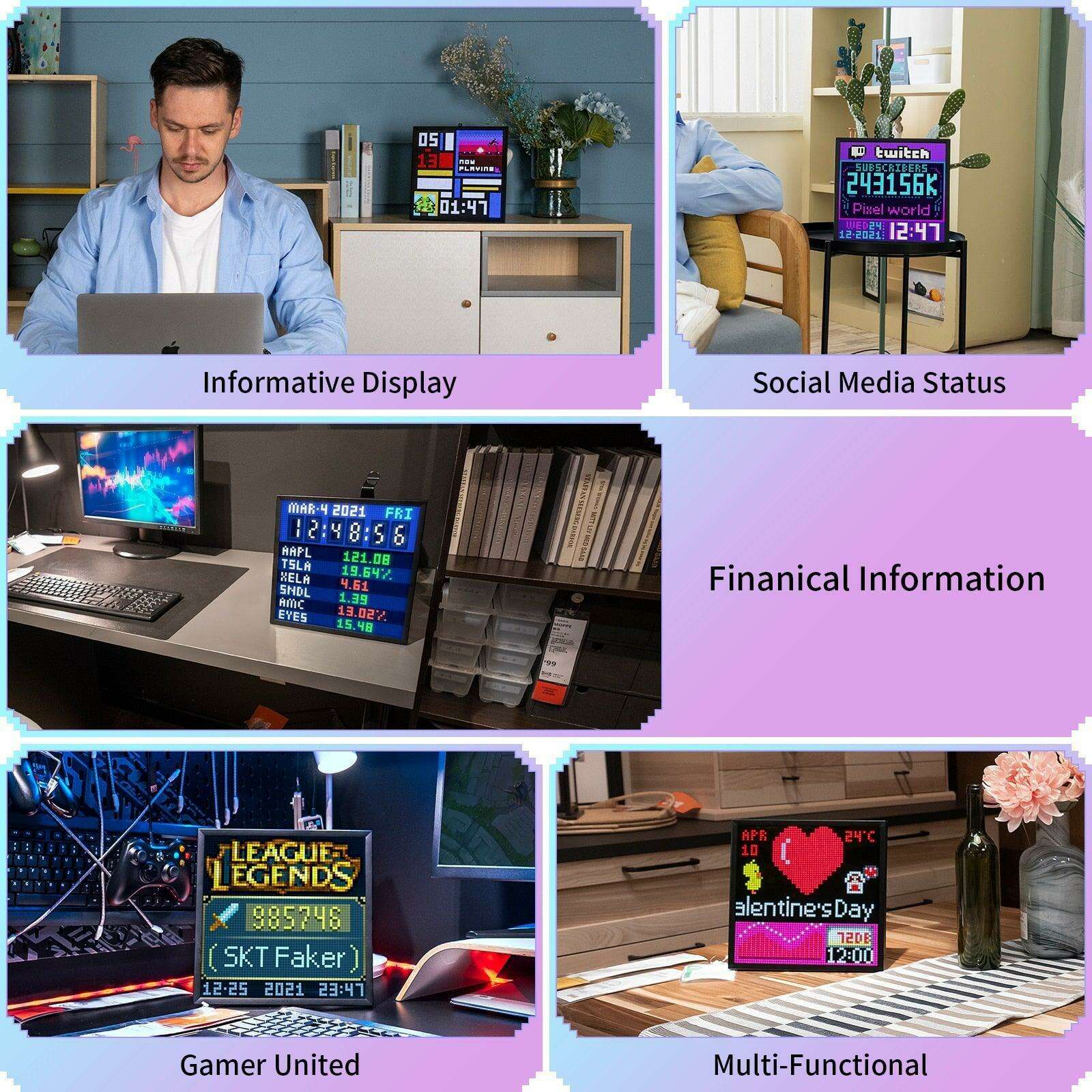 - Informative Display: Stay connected and informed with real-time updates. Whether it's social media notifications, game data, or financial market quotations, the Pixoo 64 caters to various interests and needs, making it your versatile display companion.