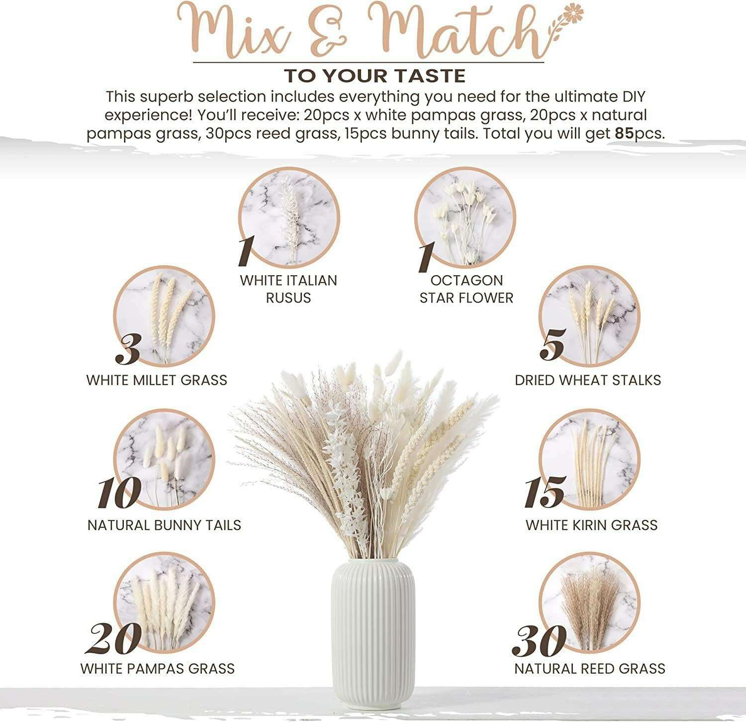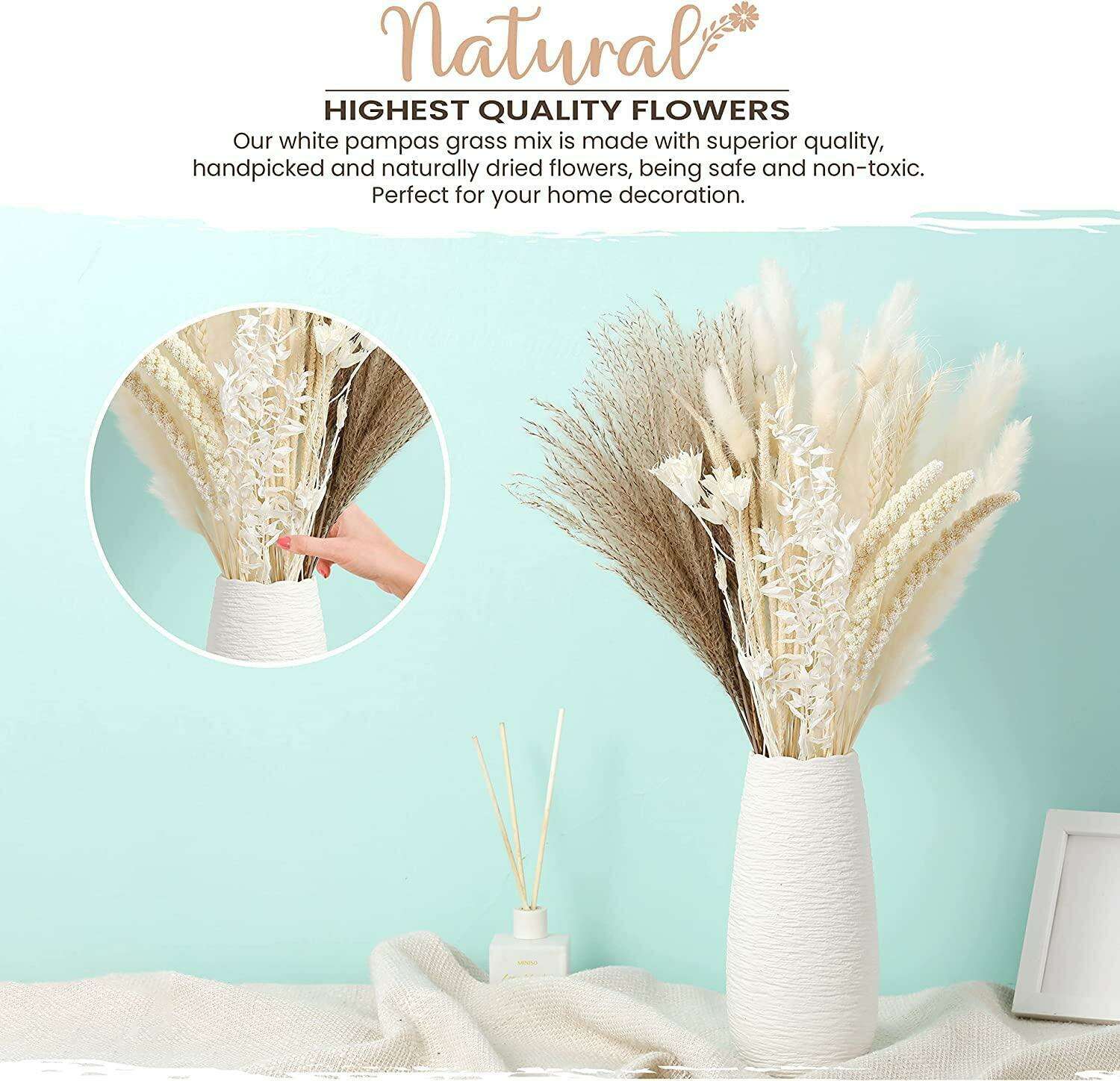 • Handpicked Natural Flowers: Enjoy a carefully curated mix of White Pampas, Natural Pampas, Reed Grass, and Bunny Tails.