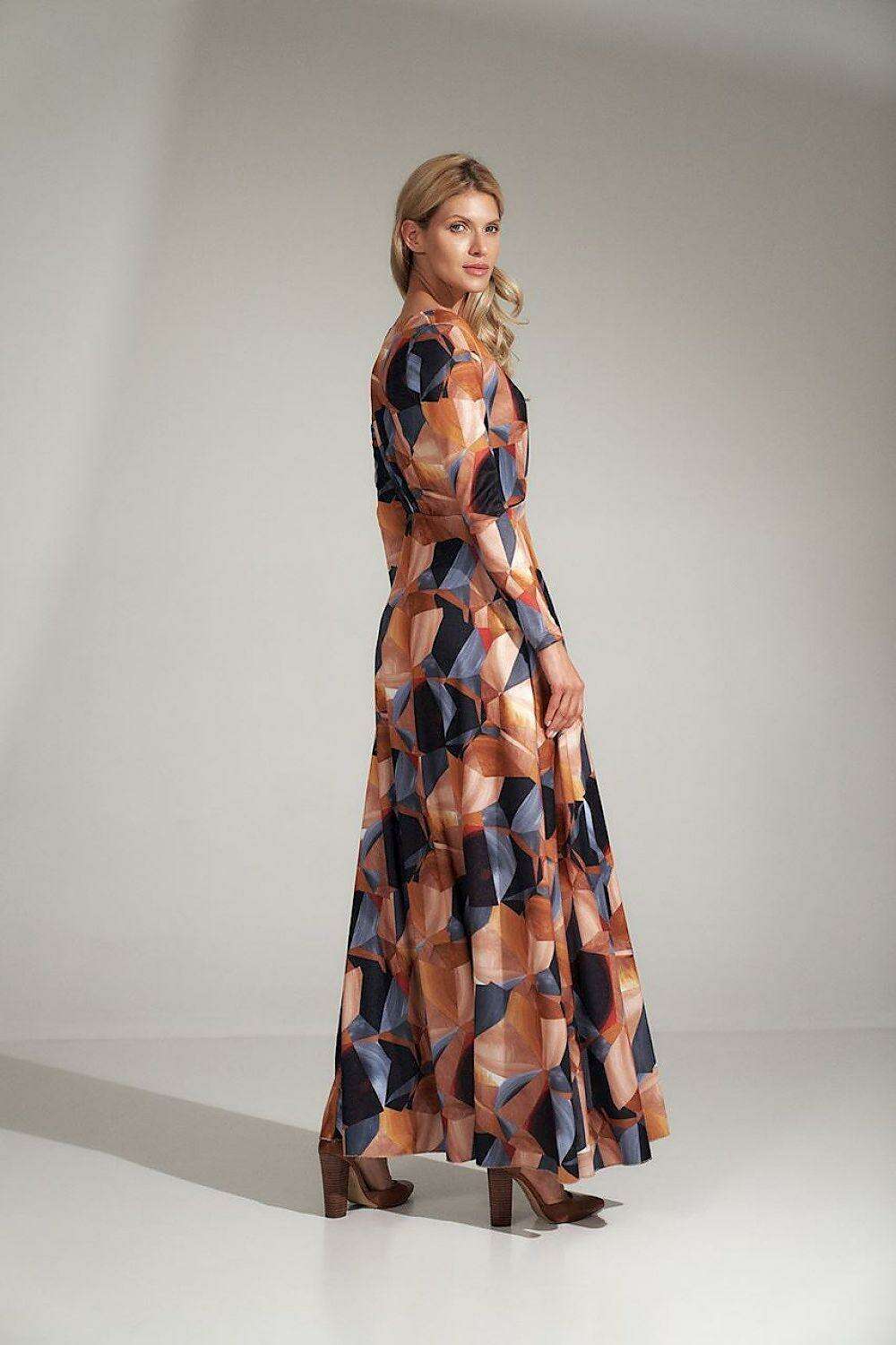 • Elegant Design: Featuring a heart neckline and a chic geometric pattern, this long, flared dress is a statement piece that exudes grace and individuality.