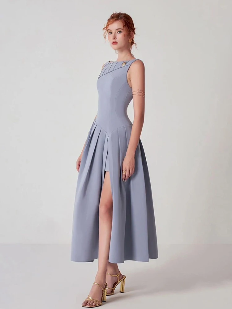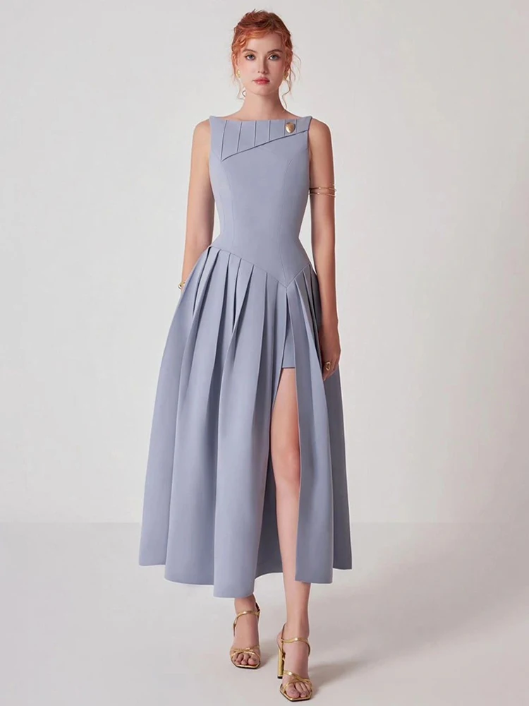 Elegant High Split Pleated Evening Dress with Zipper Waist for Women