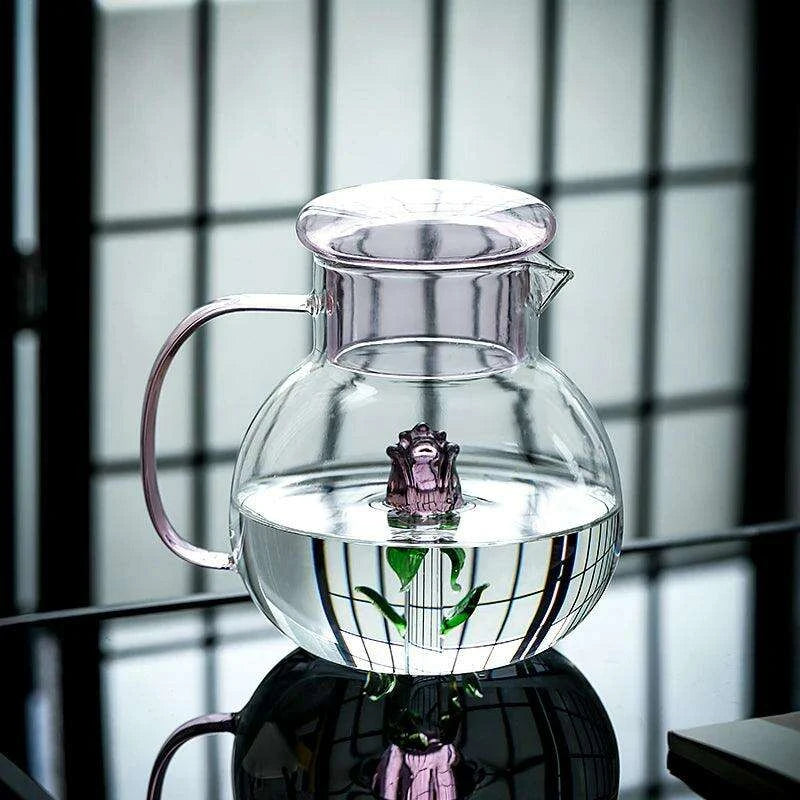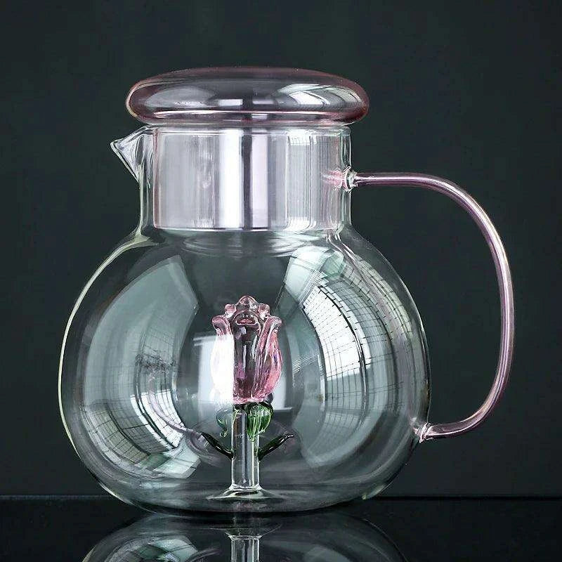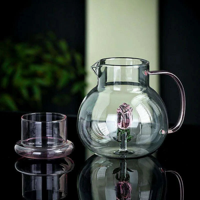 Elegant Rose Floral Glass Cold Brew Teapot - Stylish and Heat-Resistant Design with Ergonomic Handle for Entertaining..