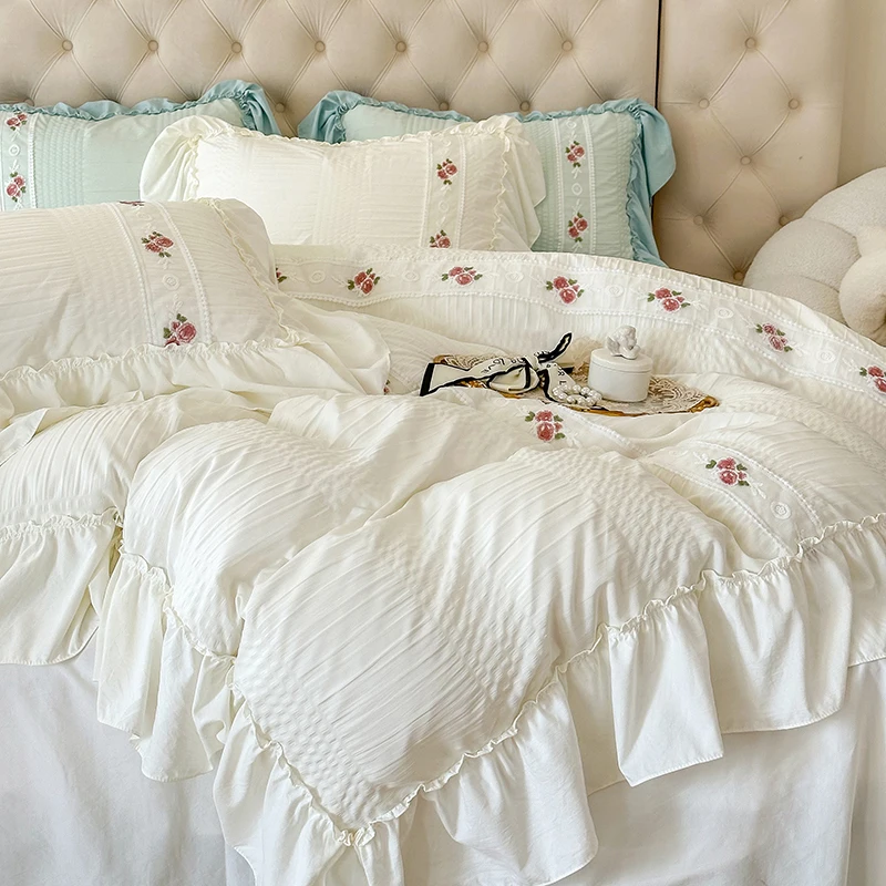 - Luxurious Design: Adorned with delicate French lace ruffles, this bedding set enhances your bedroom decor with refinement and grace.