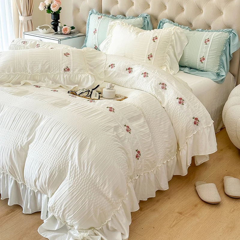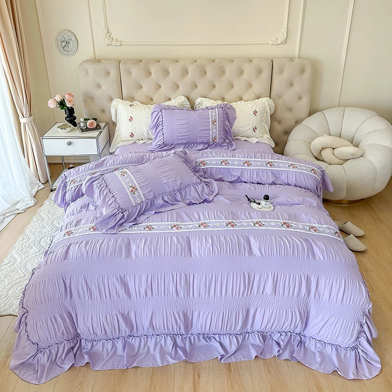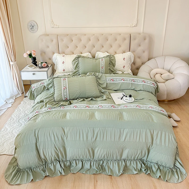 Indulge in the perfect blend of comfort and elegance with the Elegant Seersucker Lace Ruffle Bedding Set—your ideal choice for a romantic and refined bedroom atmosphere.