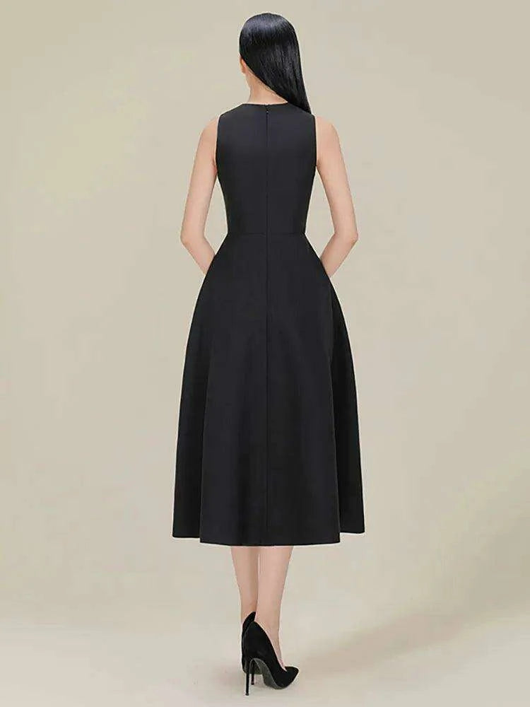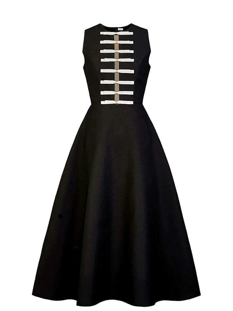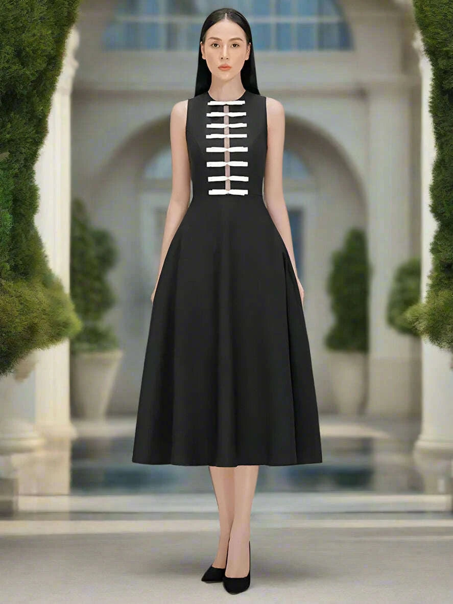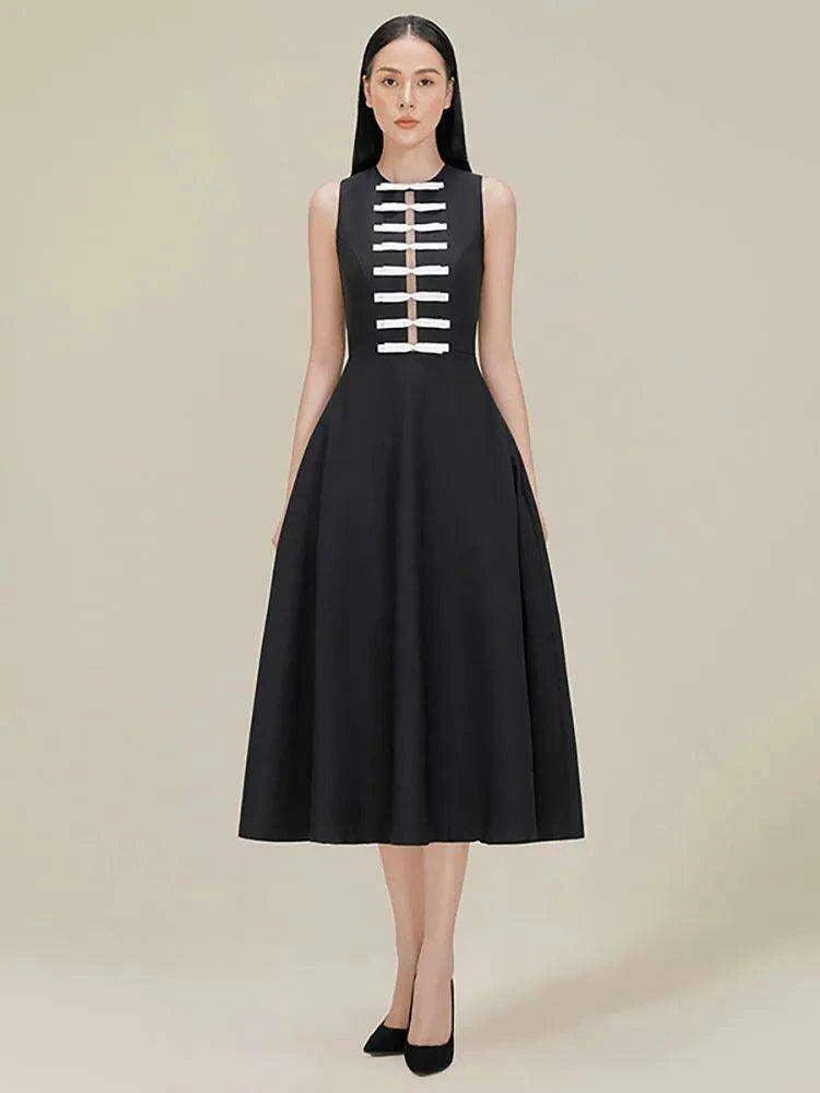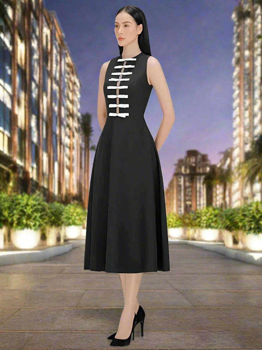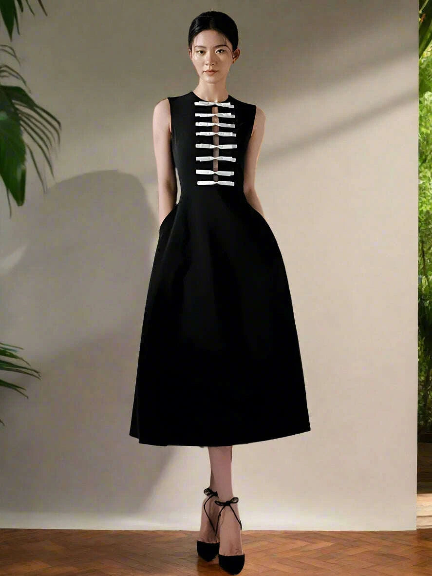 Elegant Sleeveless Women's Party Dress with Bow Accent and Cut-Out Waist - Solid Color Summer Fashion 2024