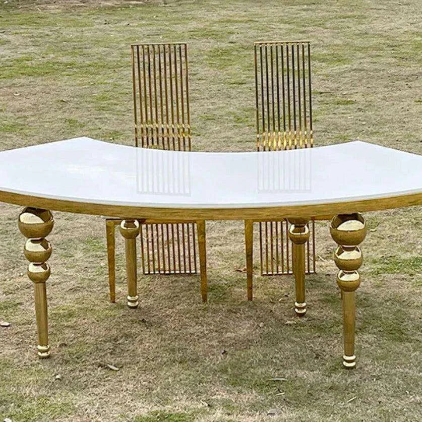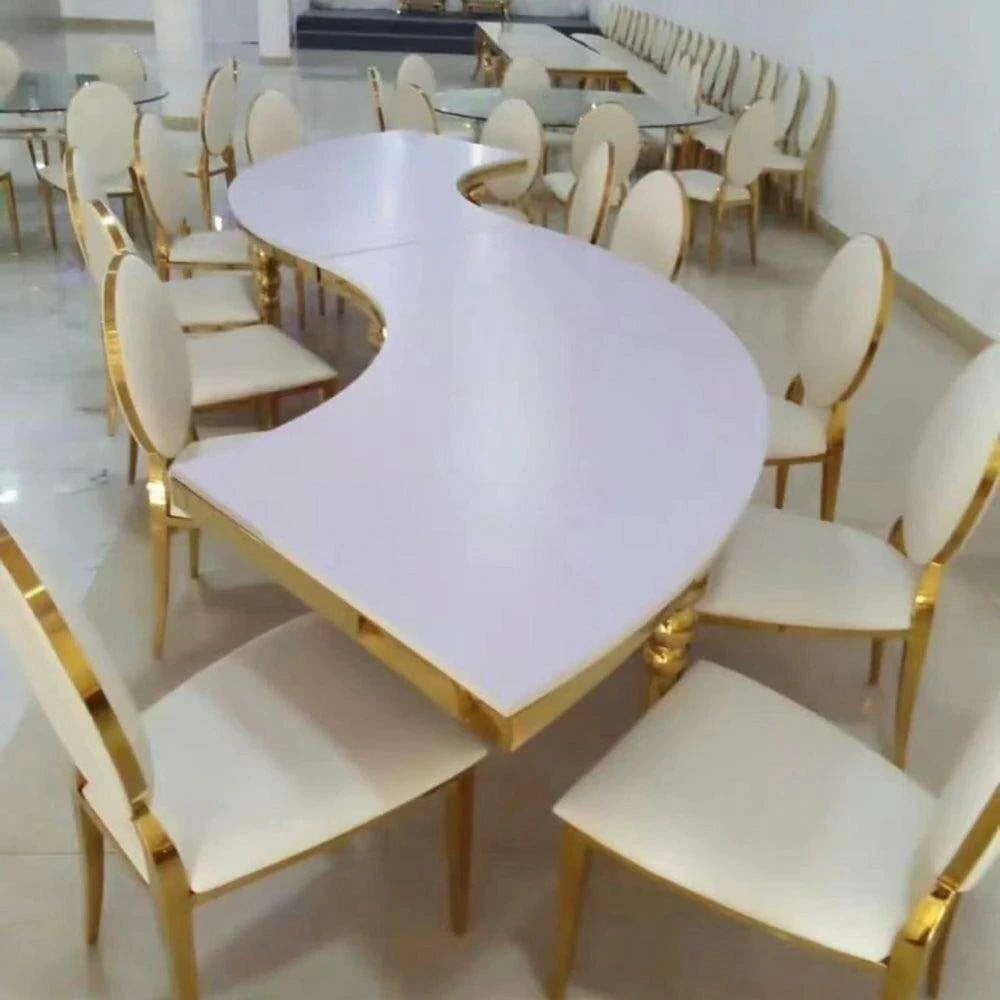 Elevate your event with our Stainless Steel Half Moon S Shape MDF Combination Table. This innovative table design seamlessly combines elegance and functionality, transforming any wedding, hotel gathering, or party into an unforgettable experience.