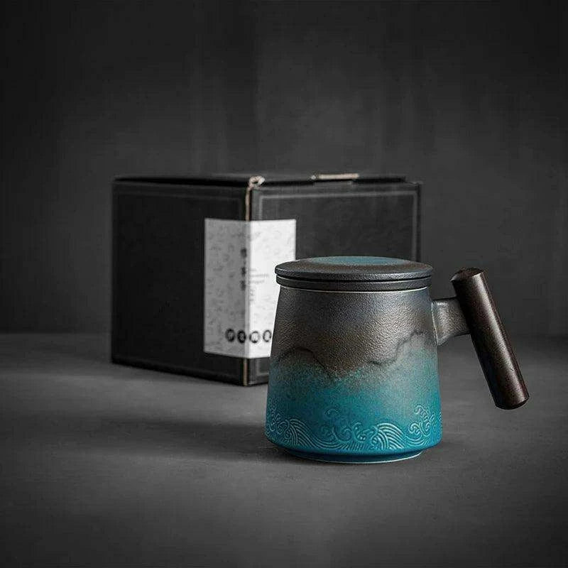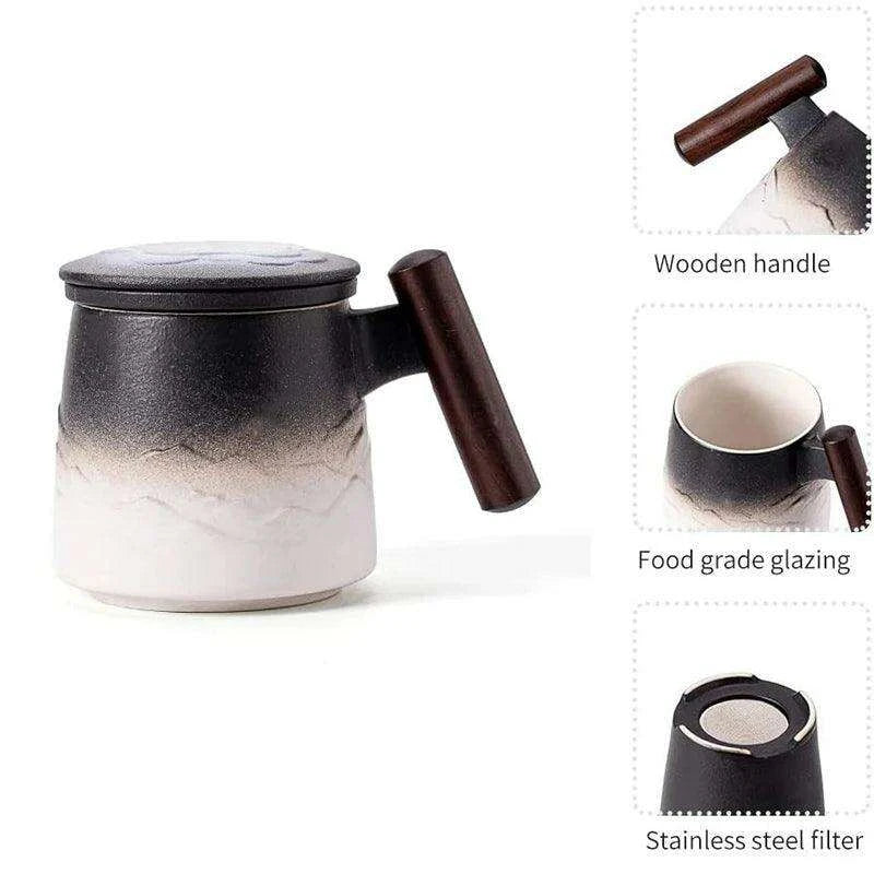 Elegant Vintage Ceramic Tea Mug Collection with Wooden Handle and Infuser Tray