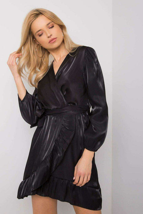 Elegant Black Frill Evening Dress With Waist Tie One Size