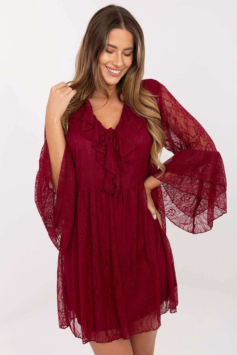 Elevate your evening look with the Lace Flared Evening Dress 219218 With Openwork Pattern, a sensational mini dress designed to emphasize femininity and charm. The delicate lace with an openwork pattern drapes into a flattering flared silhouette, while a coordinated lining ensures comfort and a smooth, elegant finish. The V-neckline, enhanced by a subtle tie, adds a graceful neckline, and the front frill with 3/4 sleeves finished in flounces delivers a romantic, stylish touch for any formal occasion.