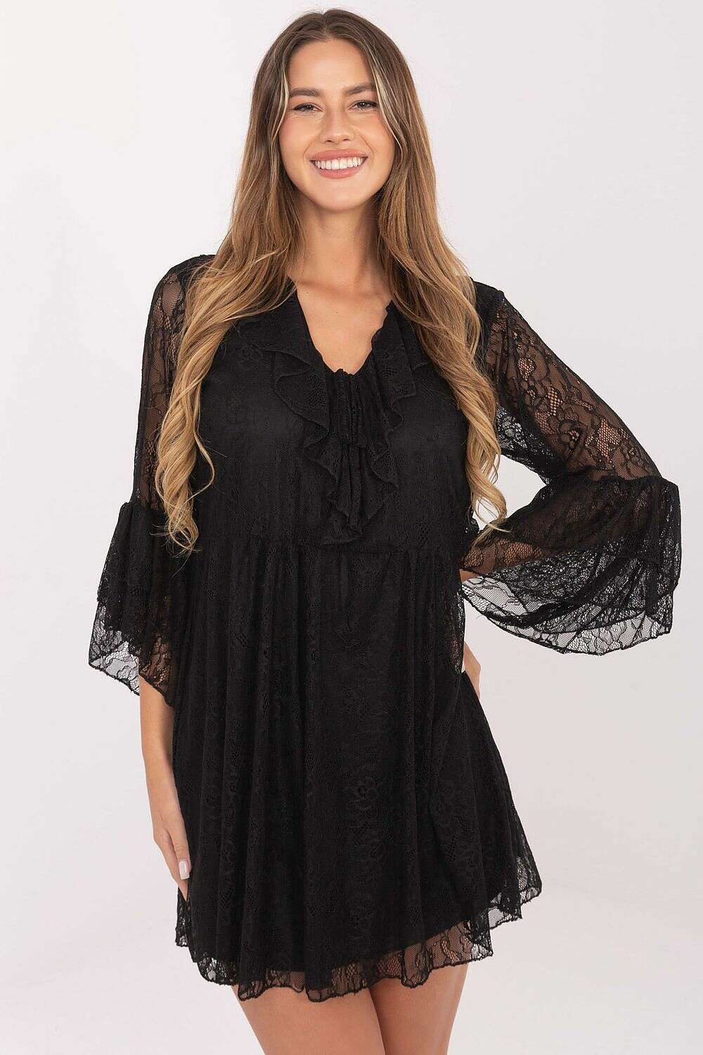 Elegant Lace Evening Dress with Flared Cut — a statement piece that emphasizes femininity and adds undeniable charm to any styling. This phenomenal lace dress features an openwork pattern and is crafted from a nylon and elastane blend, delivering a beautiful silhouette and all-day comfort. A lining ensures a smooth, elegant finish against the skin.