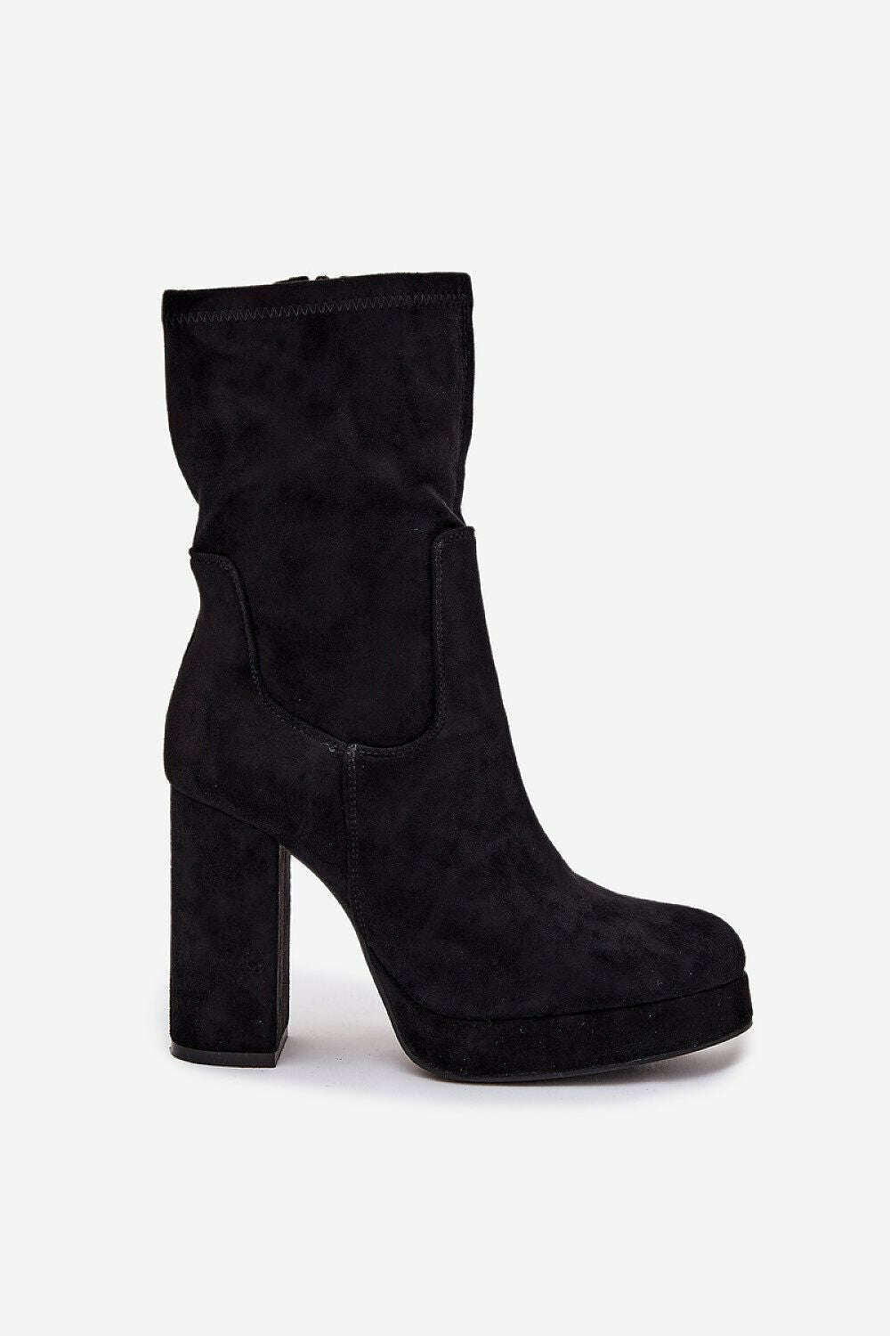 Women's ankle boots made of soft eco suede are an elegant proposition for cooler days. Set on a high column heel beautifully slim the silhouette, while providing stability when walking. The model is fastened with a zipper, which makes it easier to put on and take off. The interior lined with a shoe blanket at the height of the foot guarantees comfort and warmth there. Perfect for everyday and elegant stylizations.