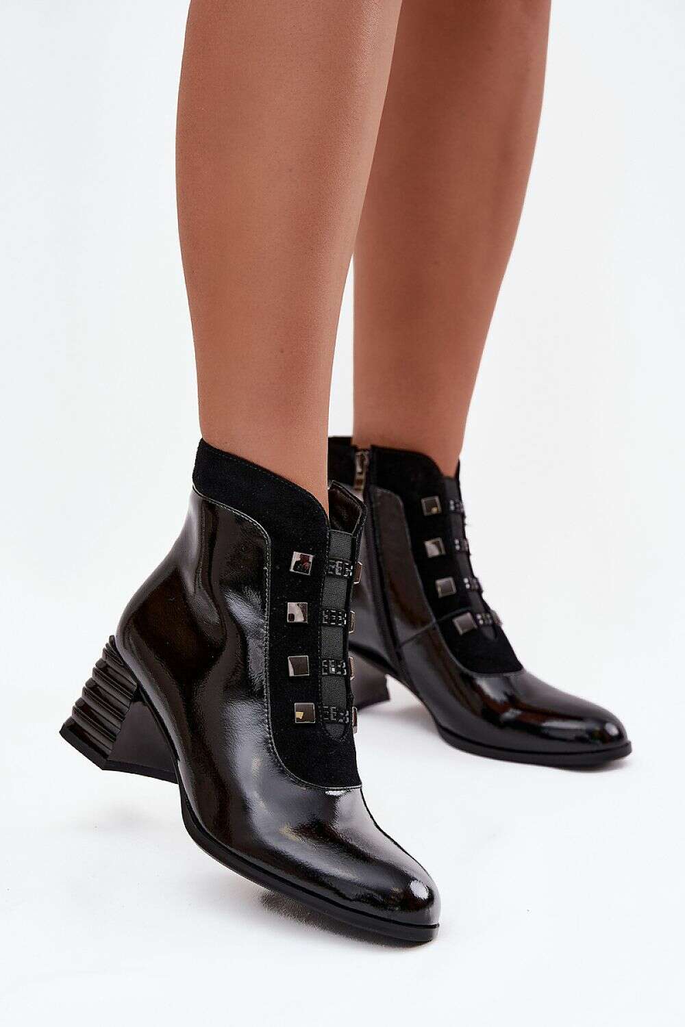 Step into timeless style with Patent Leather Women's Ankle Boots Block Heel 219244. Crafted from natural patent leather, the shiny upper catches the light and makes a statement, while decorative detailing at the front gives each pair a distinctive character. The silhouette sits on a stable block heel, adding height without sacrificing all-day comfort.