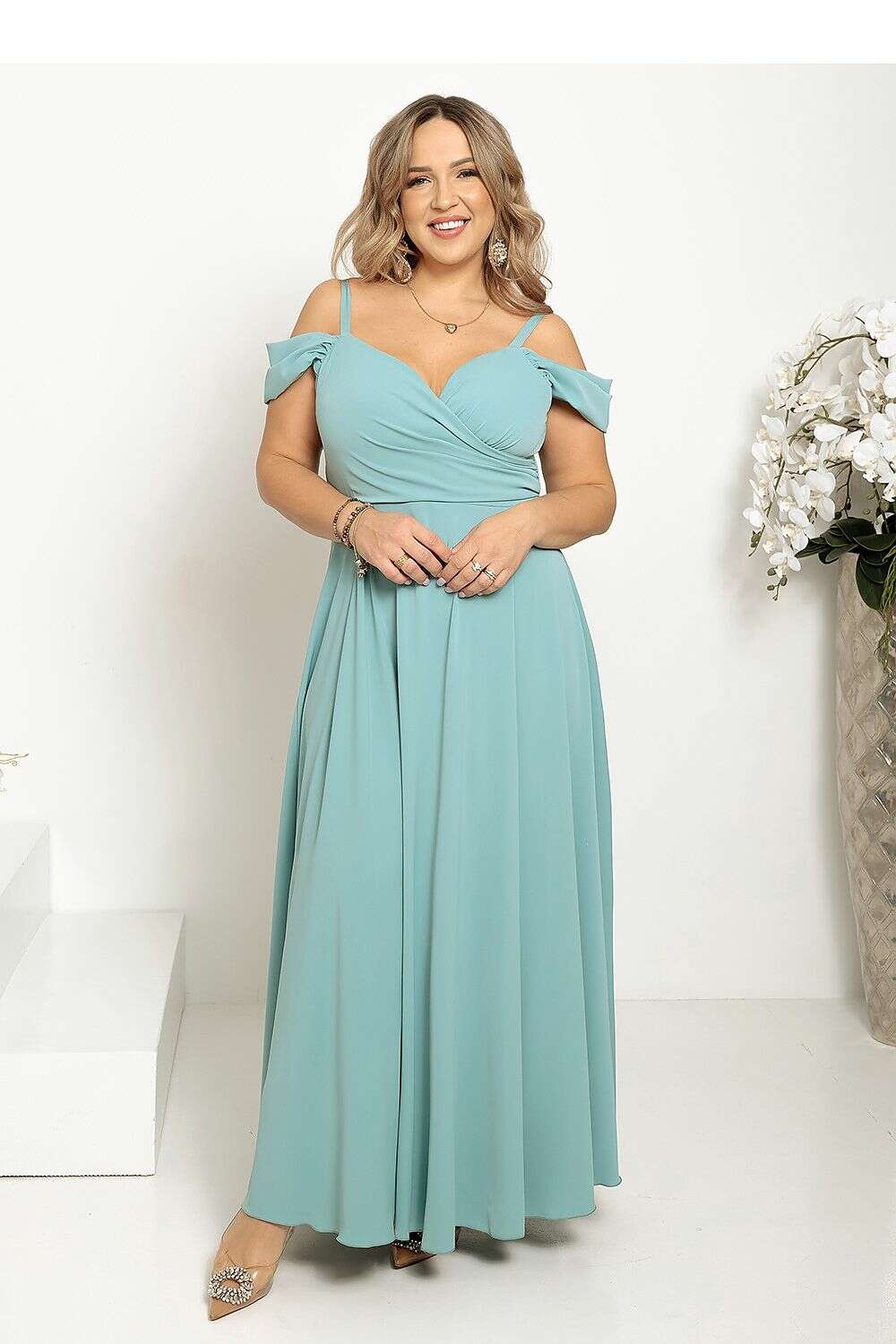 Elegant long dress with a wrap neckline, thin straps, and sleeves. The dress is cut at the waist, fastened with a concealed zipper, flared bottom with a slit. The dress is made of flowing smooth fabric.