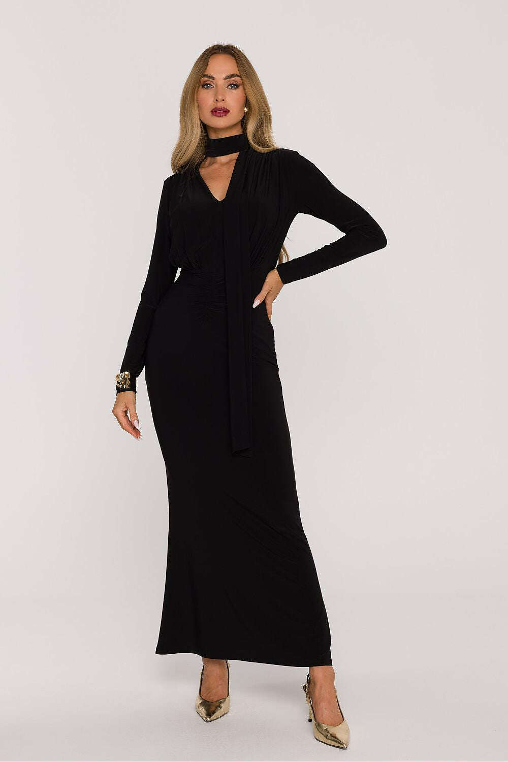 The V-neckline subtly flatters the neck and décolletage, while long fitted sleeves frame the silhouette. A waist with delicate draping creates feminine curves, and the long, slightly flared hem provides a sensual, slimming line.