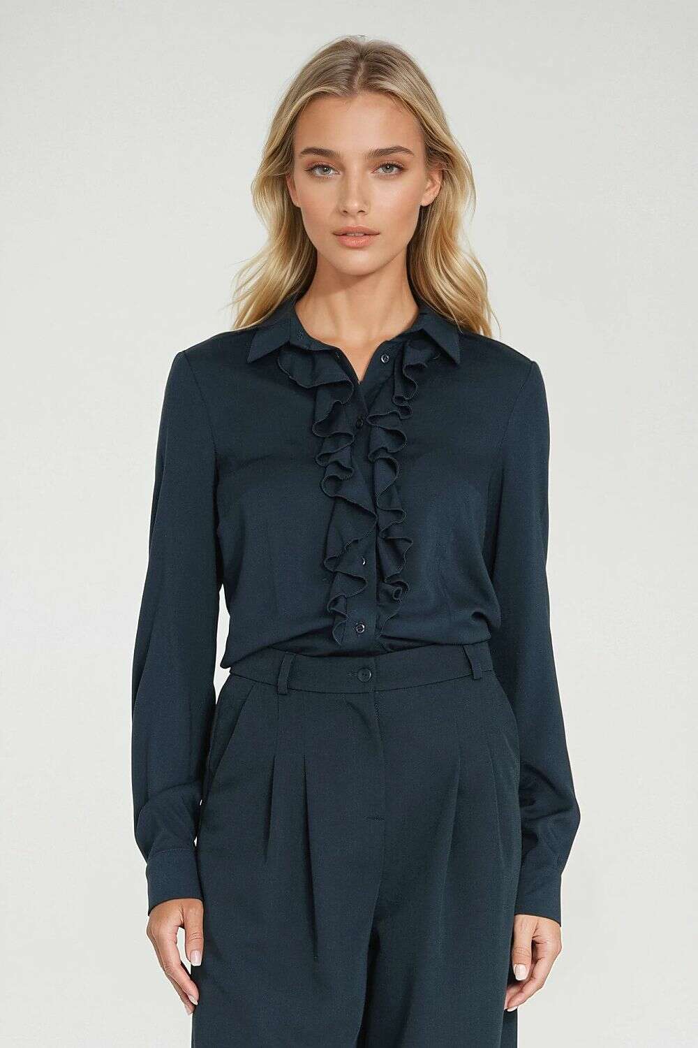 Elevate your wardrobe with the Women's Long Sleeve Shirt 218899 With Jabot Detail Edition. This fitted shirt elegantly emphasizes the silhouette while delivering timeless style. A classic collar and long sleeves form a versatile base, while a spectacular decorative jabot along the front adds a unique, feminine character. The refined button-front closure completes the look, making it an ideal choice for both the office and special occasions where style and subtle elegance matter. Crafted from 100% viscose for a soft drape and comfortable wear.