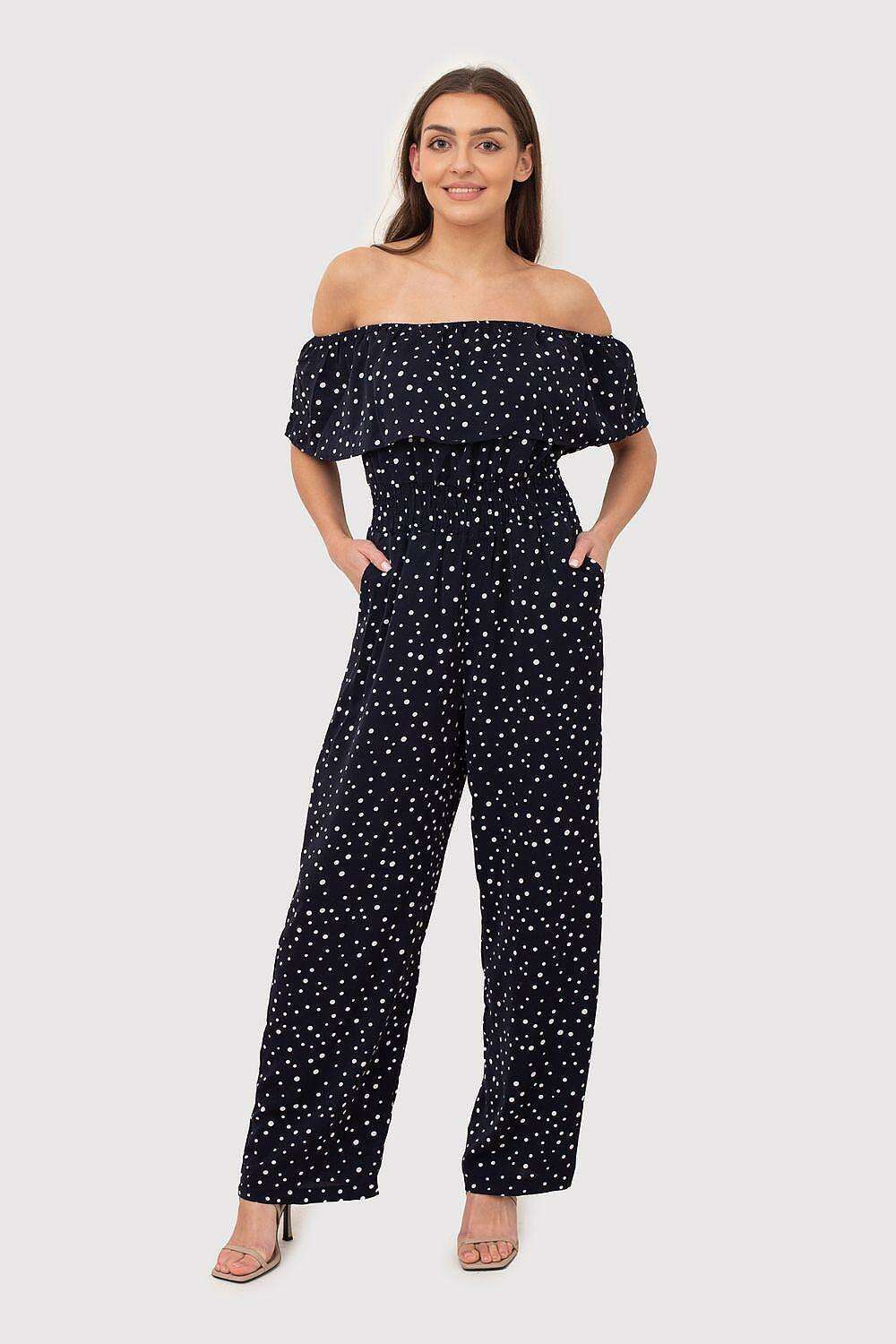 Step into elegance and charm with our Navy Blue Polka Dot Off-Shoulder Jumpsuit. This captivating piece perfectly blends sophistication and playful style, making it an ideal choice for any occasion, whether it's a day out or an evening gathering.