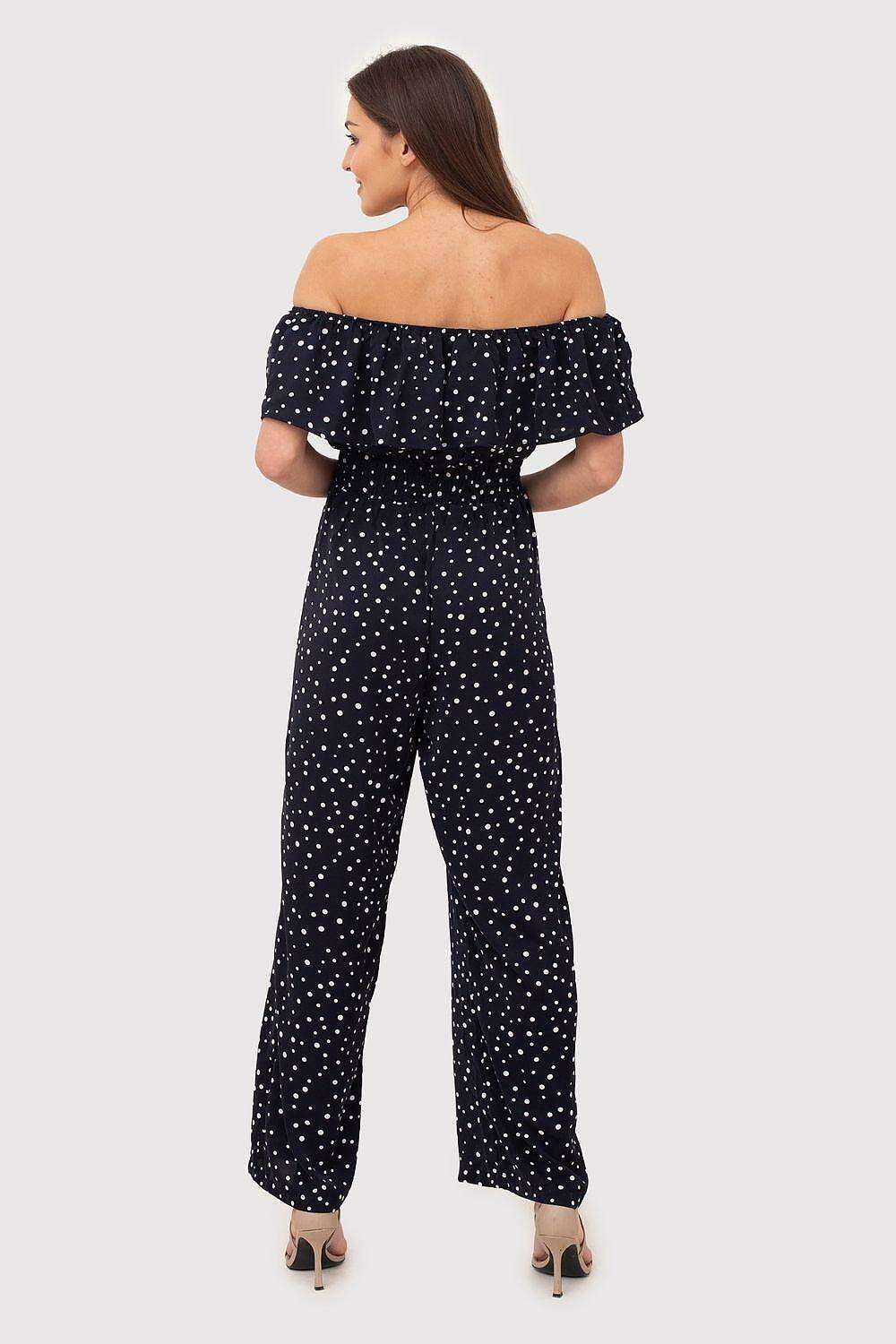 Navy Blue Polka Dot Bardot Jumpsuit with Playful Ruffled Waist