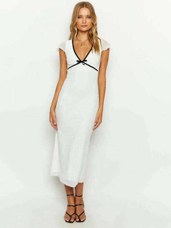 New bow-trimmed low-cut sexy V-neck short-sleeved butt-covering dress