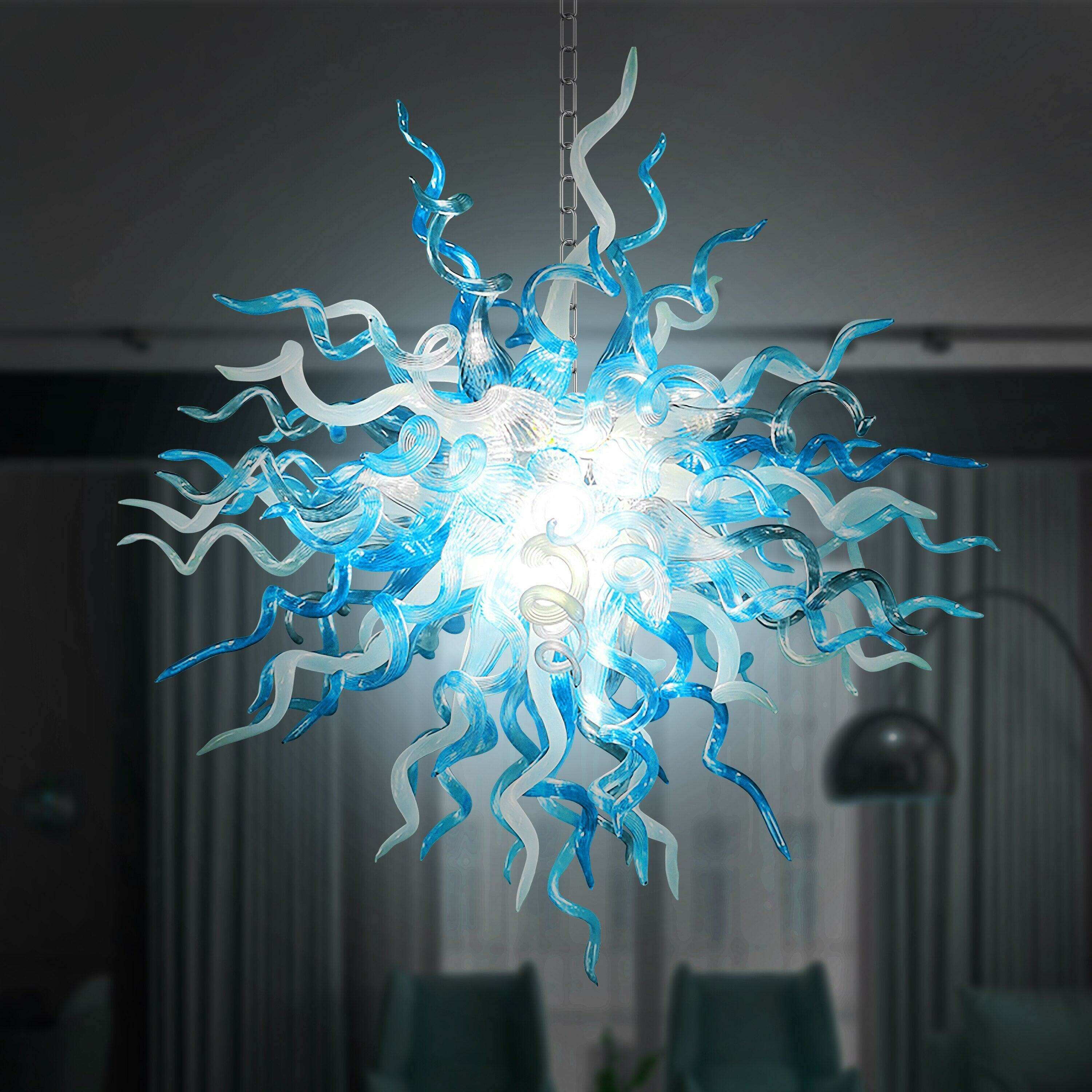 Transform your living space into a sanctuary of luxury with our Elegant Ocean Blue Hand-Blown Glass Chandelier. This stunning lighting fixture is not merely a décor addition; it's an artisanal masterpiece that infuses sophistication and charm into any environment.