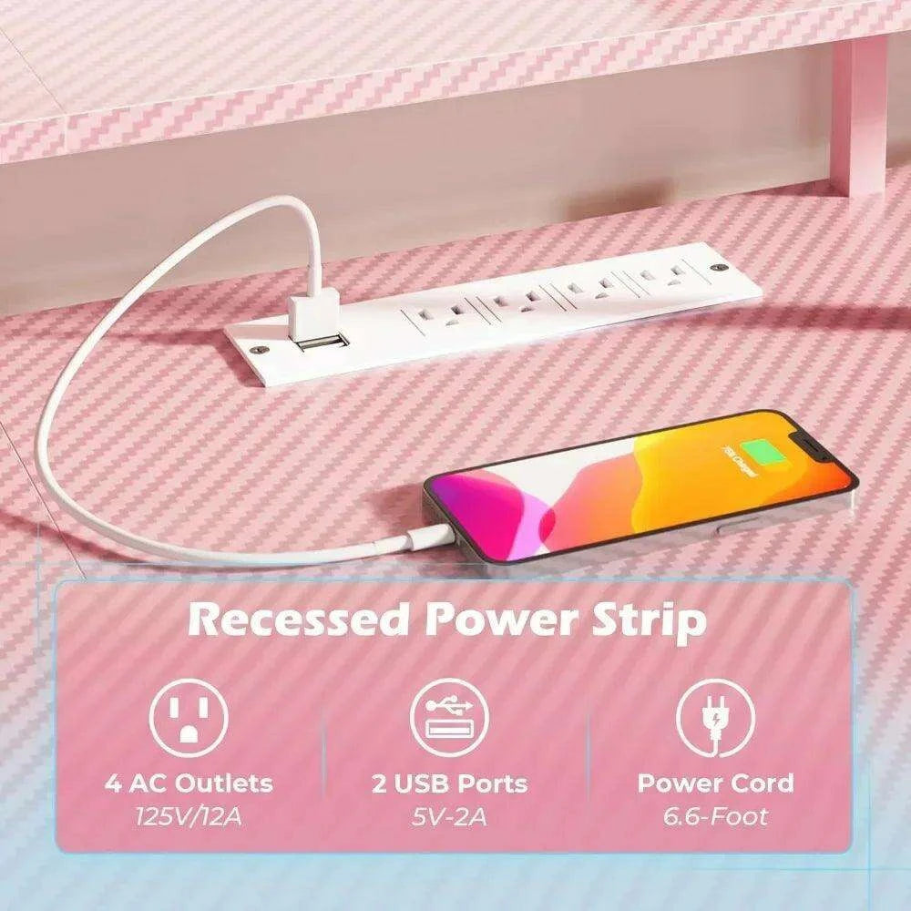 Pink Carbon Fiber L-Shaped Gaming Desk with Custom LED Ambiance, Power Ports, and Ample Storage