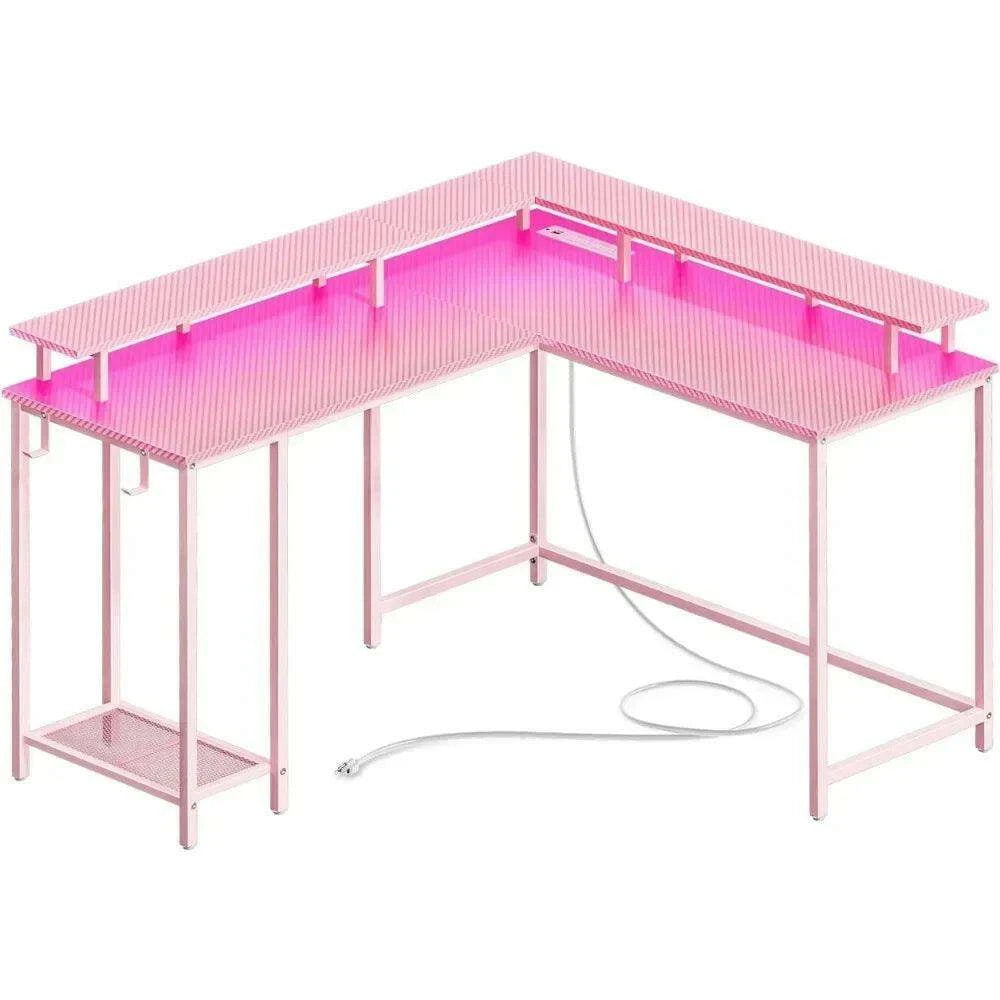 Pink Carbon Fiber L-Shaped Gaming Desk with LED Lights, Power Outlets, and Storage Options