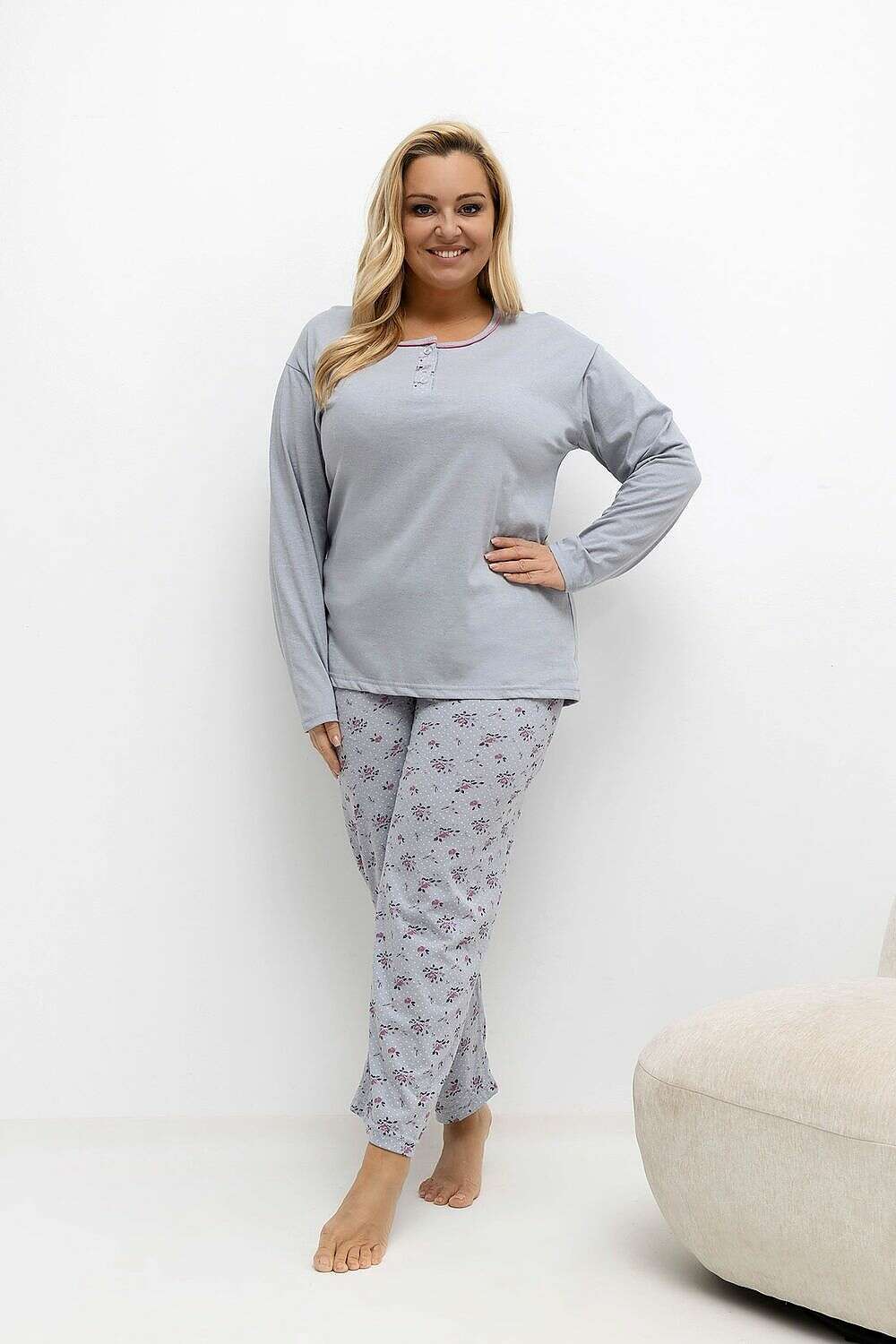 Experience elevated comfort and chic design with this plus size cotton pajama set. The long sleeve blouse with decorative buttons pairs seamlessly with straight-leg floral and polka dot pants for a modern, feminine look.