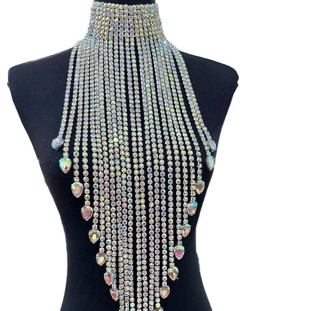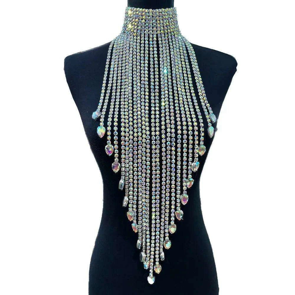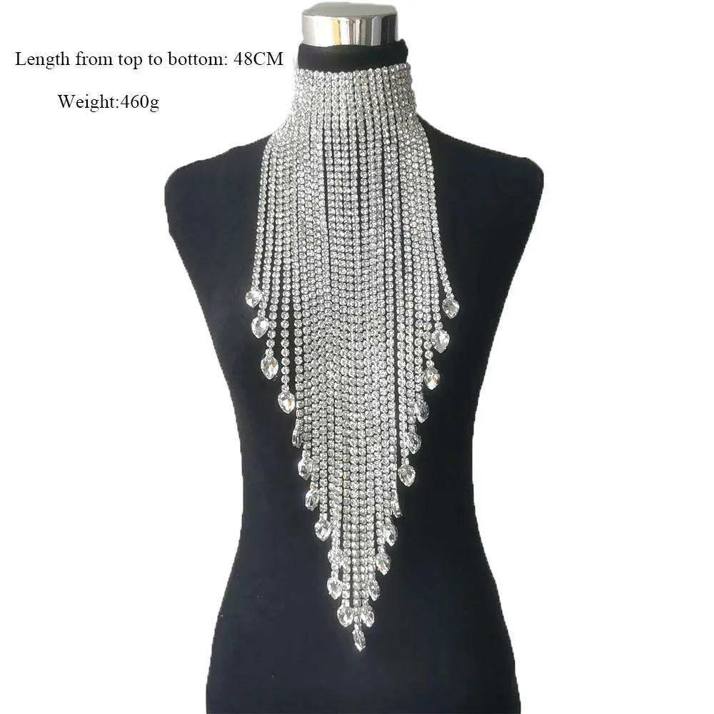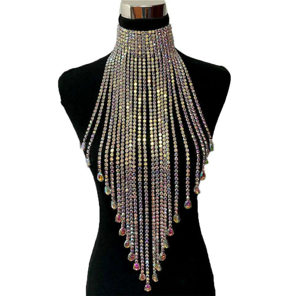 Radiant Rhinestone and Glass Gemstone Tassel Choker Necklace - Crystal AB Silver Elegance