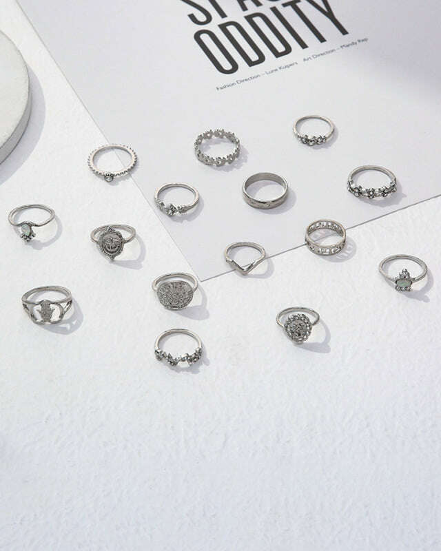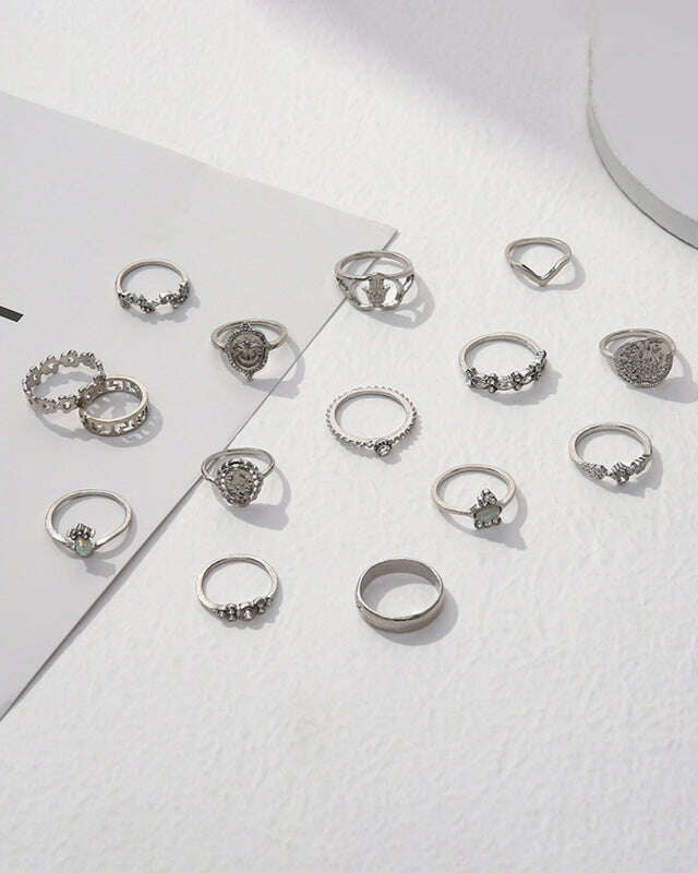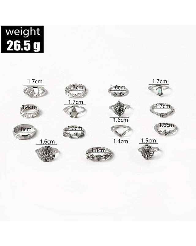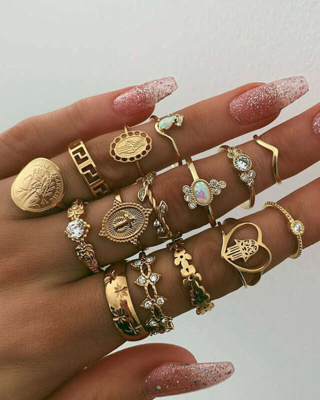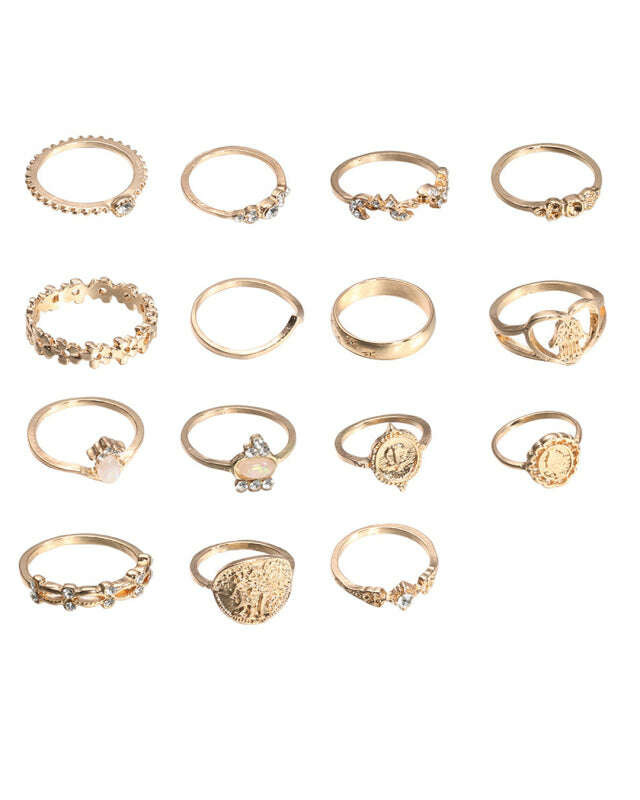 Retro Beauty Head Portrait Gold Coin Cross Pattern Love Fatima Palm Ring 15-piece Ring Set