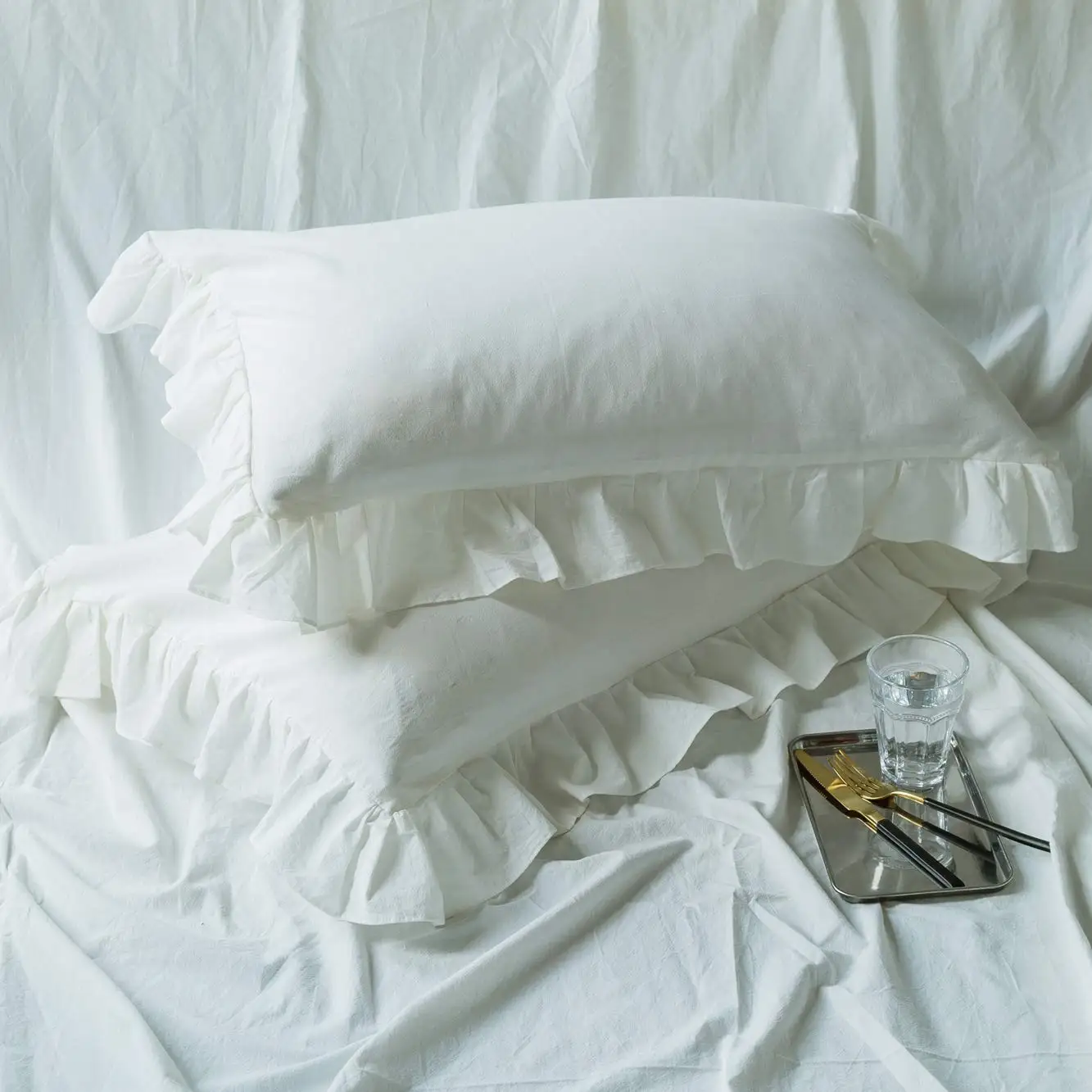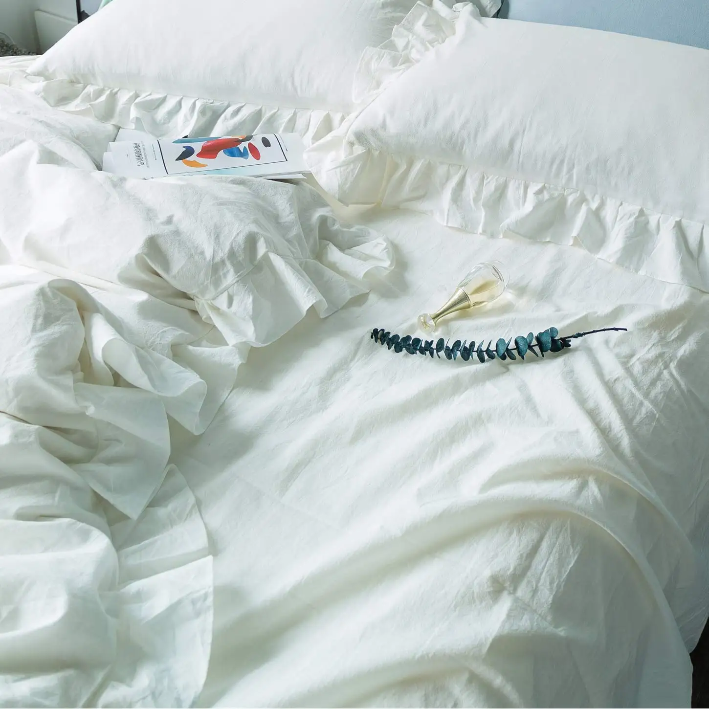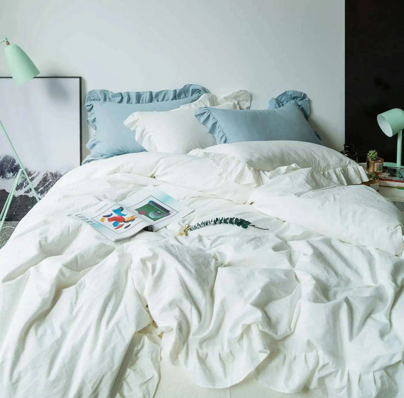 Transform your bedroom into a sanctuary of elegance with our exquisite Romantic Vintage White Ruffled King Duvet Cover Set. Crafted from 100% washed cotton, this set brings a touch of romance and charm, making it the perfect addition to elevate your home decor.