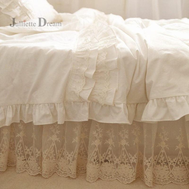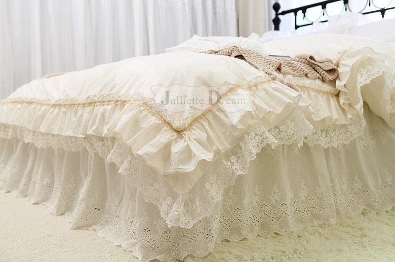 Tranquil Dream Lace Yarn Bedding Ensemble with Ruffle Accents for Serene Nights