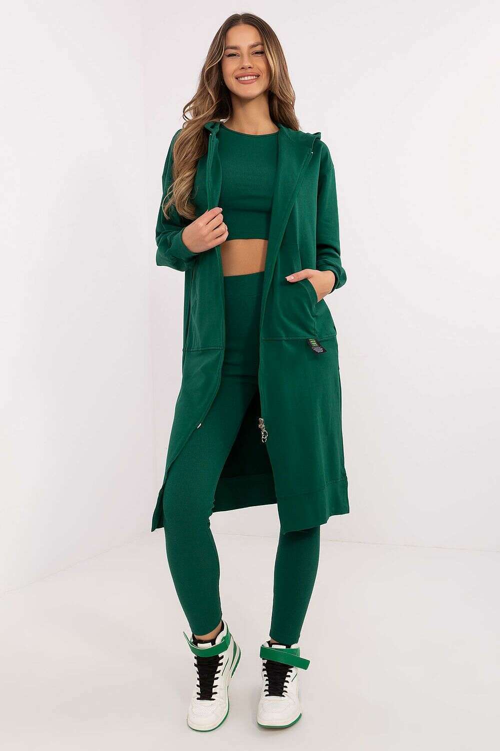 Women's set consisting of a hoodie, top, and leggings is a harmonious combination of casual and sporty style. Designed with daily comfort and activity in mind, it will work great both during training and relaxation. The hoodie with an extended cut is a practical solution for cooler days. Fastened with a zipper and equipped with slip pockets, it provides comfort and functionality. Made of a blend of cotton, polyester, and elastane, it combines softness with elasticity. Long sleeves and a hood additionally protect against wind and cold. The top with a round neckline is simple yet universal, perfectly matched to the entire set. Its composition of cotton and elastane guarantees breathability and comfort. Leggings with tapered legs and a high waistline emphasize the silhouette, while providing full freedom of movement. Made of cotton and elastane, they are characterized by elasticity and durability. An additional feature is the ribbed structure of the material, which gives them a unique character. The smooth pattern of the whole set fits perfectly into a daily, sporty look, offering both style and maximum comfort of use. Material composition: Hoodie: 72% cotton, 22% polyester, 6% elastane Leggings and top: 90% cotton, 10% elastane