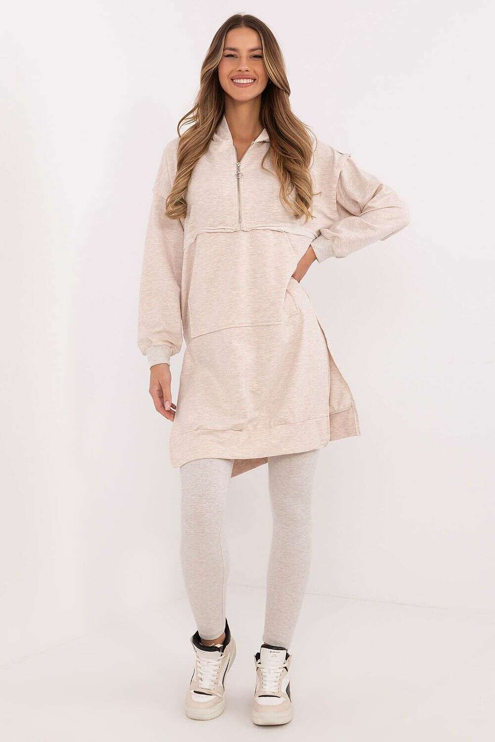 A women's set consisting of a long sweatshirt and leggings is the perfect choice for everyday casual styling. Practical, comfortable, and stylish, it will work perfectly for walks, meetings with friends, or relaxing at home. The elongated sweatshirt made of a soft and stretchy blend of cotton and elastane provides maximum wearing comfort. Equipped with a spacious hood and long sleeves, it is perfect for cooler days. The kangaroo pocket on the front adds functionality and a casual character. Leggings with tapered legs and a high waistline emphasize the silhouette, while guaranteeing full freedom of movement. Made of cotton with elastane, they perfectly fit the body, ensuring comfort throughout the day. The set in a smooth pattern is a harmonious whole that can be easily complemented with favorite accessories. It is an excellent solution for women who value style and comfort in everyday life.