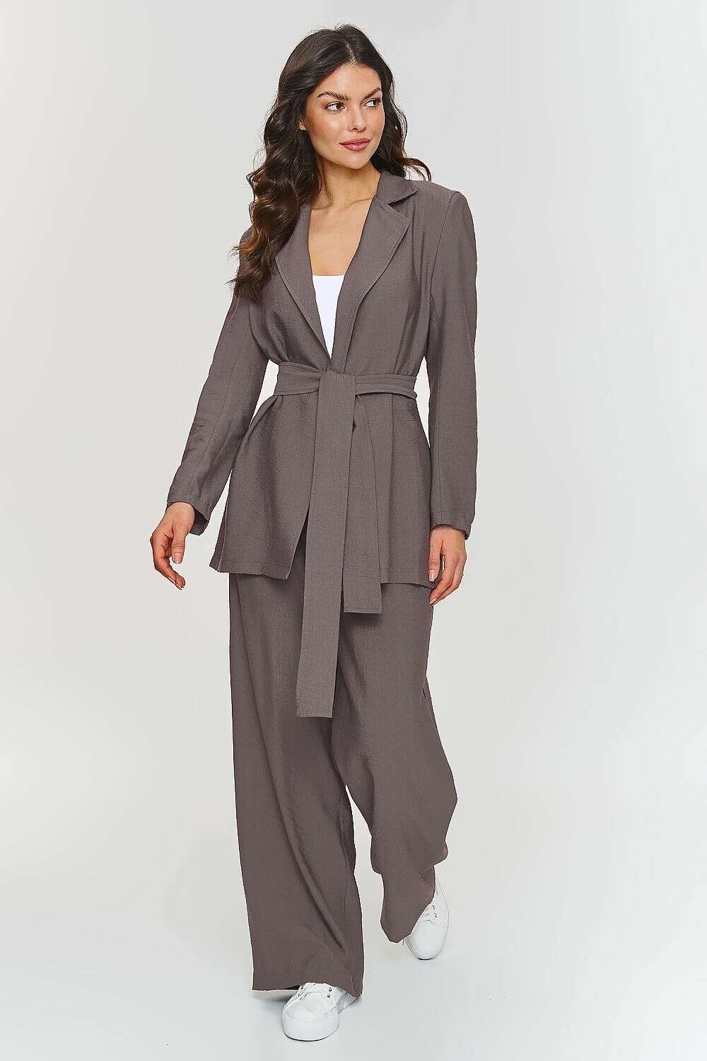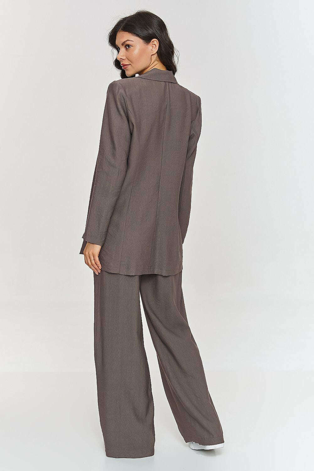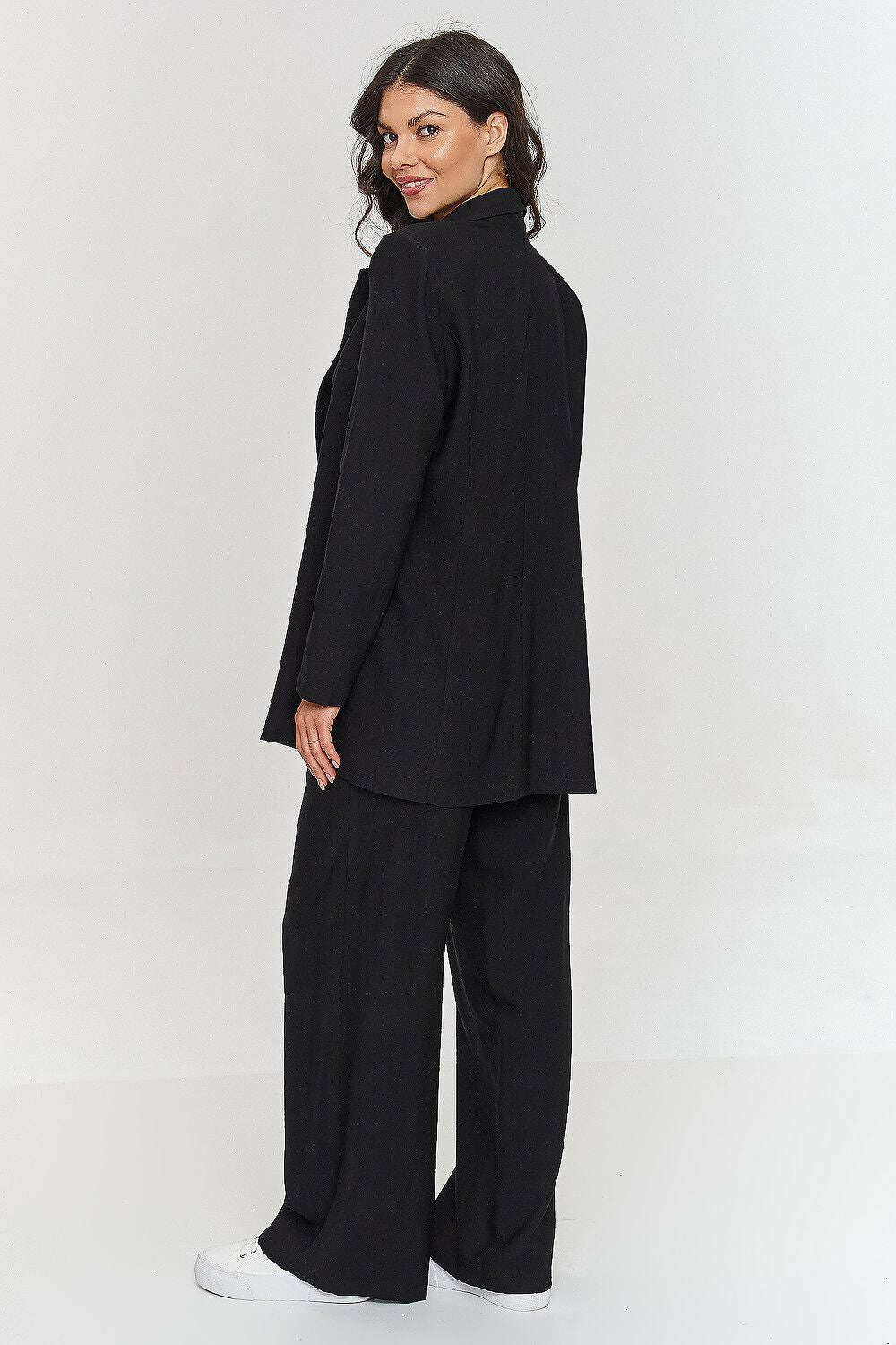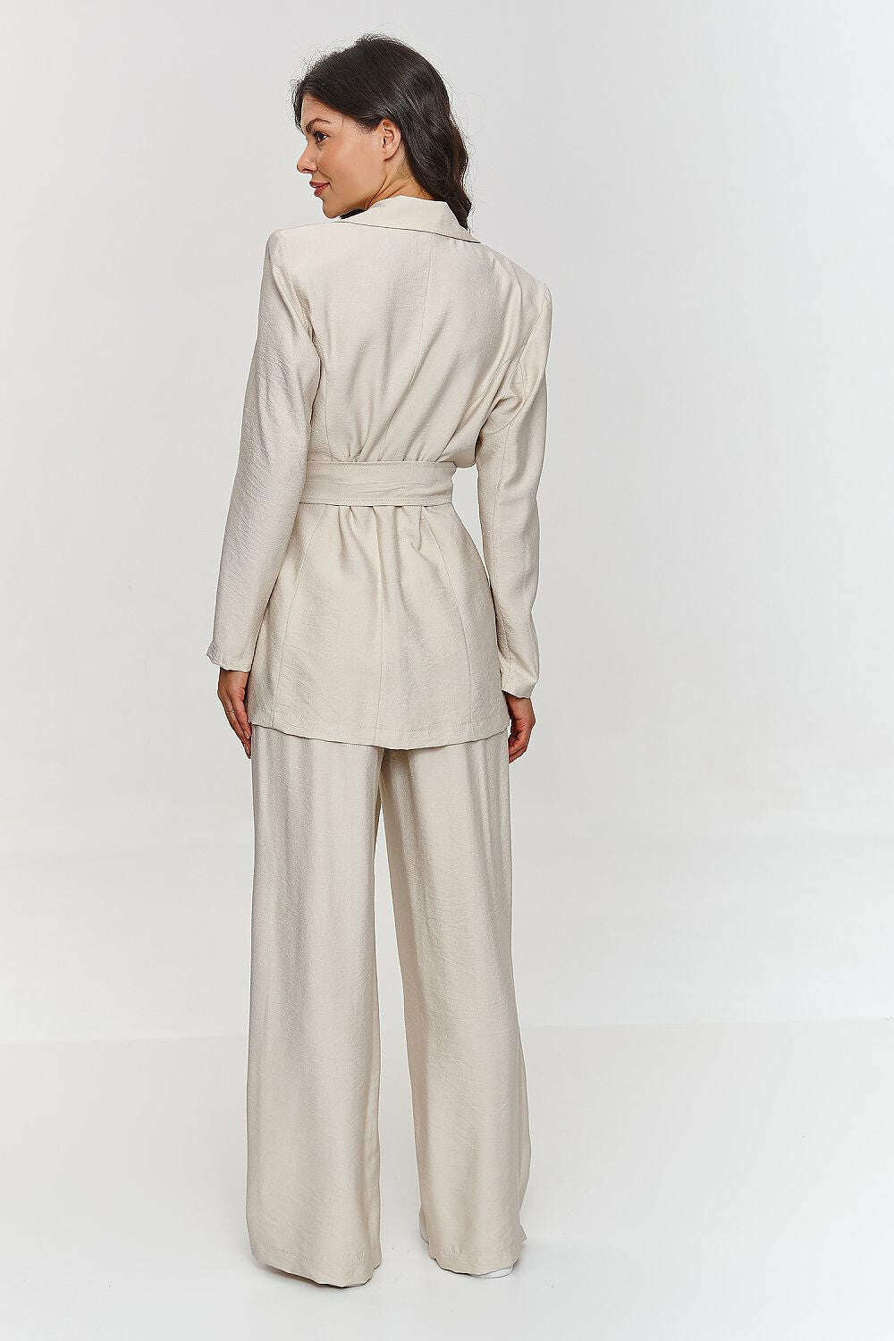 This women's set was designed with women in mind who are looking for a combination of style, comfort, and modern elegance. The longer, loose-cut jacket gives the styling a modern character, and the tied belt allows for a tailored fit, emphasizing the waistline. It does not have a lining, making it lighter and more relaxed. Wide-legged pants emphasize a fashionable look, and the elastic waistband ensures maximum comfort. The model is made of lightweight, structural material that accentuates its uniqueness and class. An additional advantage is the ability to wear each element separately, creating diverse and original outfits. Thanks to its simple yet striking design, the set is a perfect solution for outings with friends as well as for the office, business meetings, and other formal occasions where you want to look professional while not sacrificing comfort.