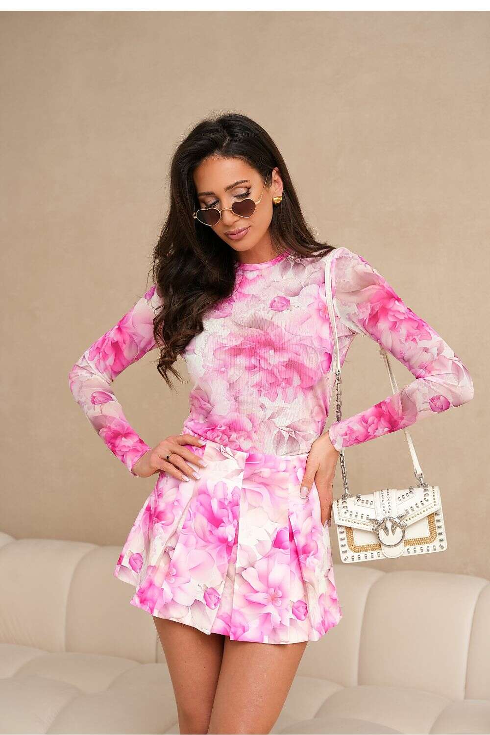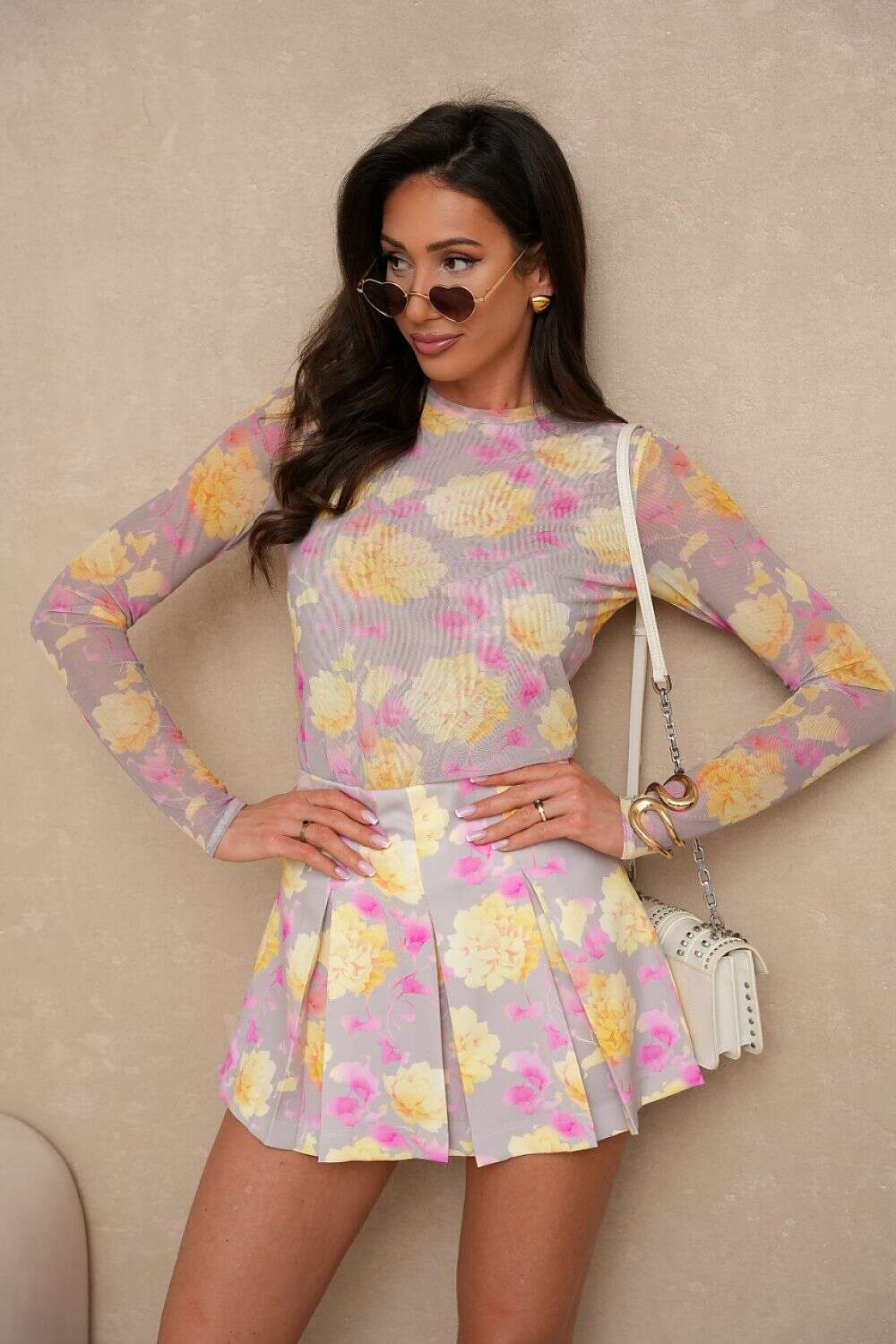 Elegant and stylish women's set that combines subtlety with modern design. The blouse made of light, transparent tulle with long sleeves and a round neckline adds feminine charm and delicacy to the styling. Skirt shorts are a functional and fashionable solution, fastened with a concealed zipper, ensuring comfort, while pleats on the front add an elegant character and lightness to them. The colorful print attracts attention and gives the whole a unique expression. An ideal choice for special occasions, social gatherings, or fashionable urban stylizations. Blouse composition: 70% viscose, 30% elastane Skirt shorts composition: 95% viscose, 5% elastane