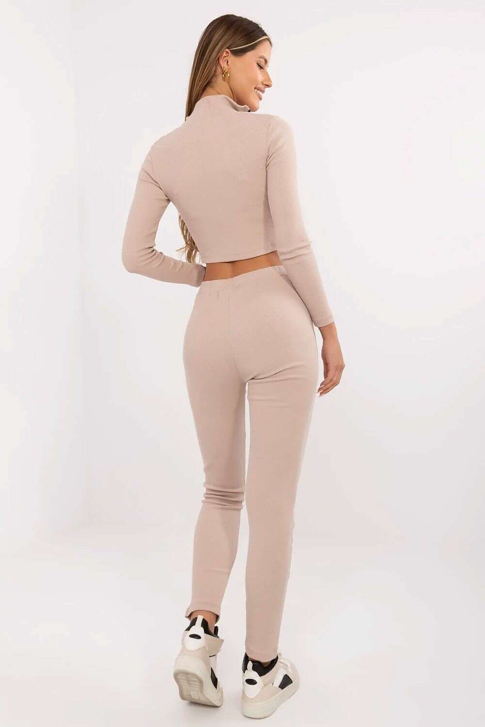 Beige Ribbed Women Set With Standup Collar Blouse Trousers